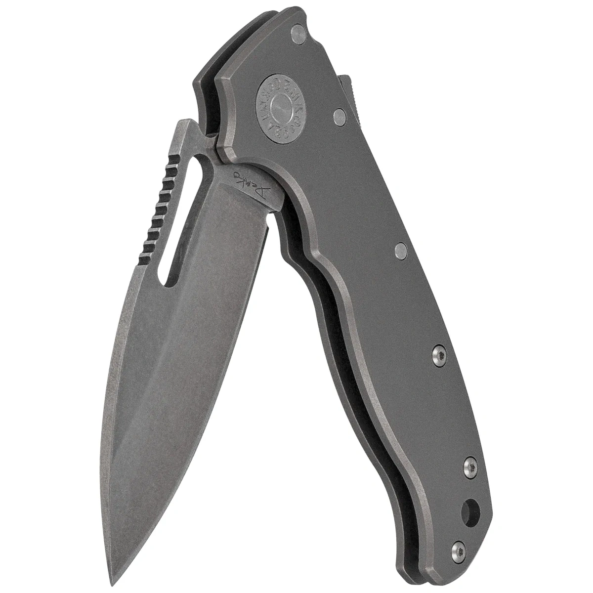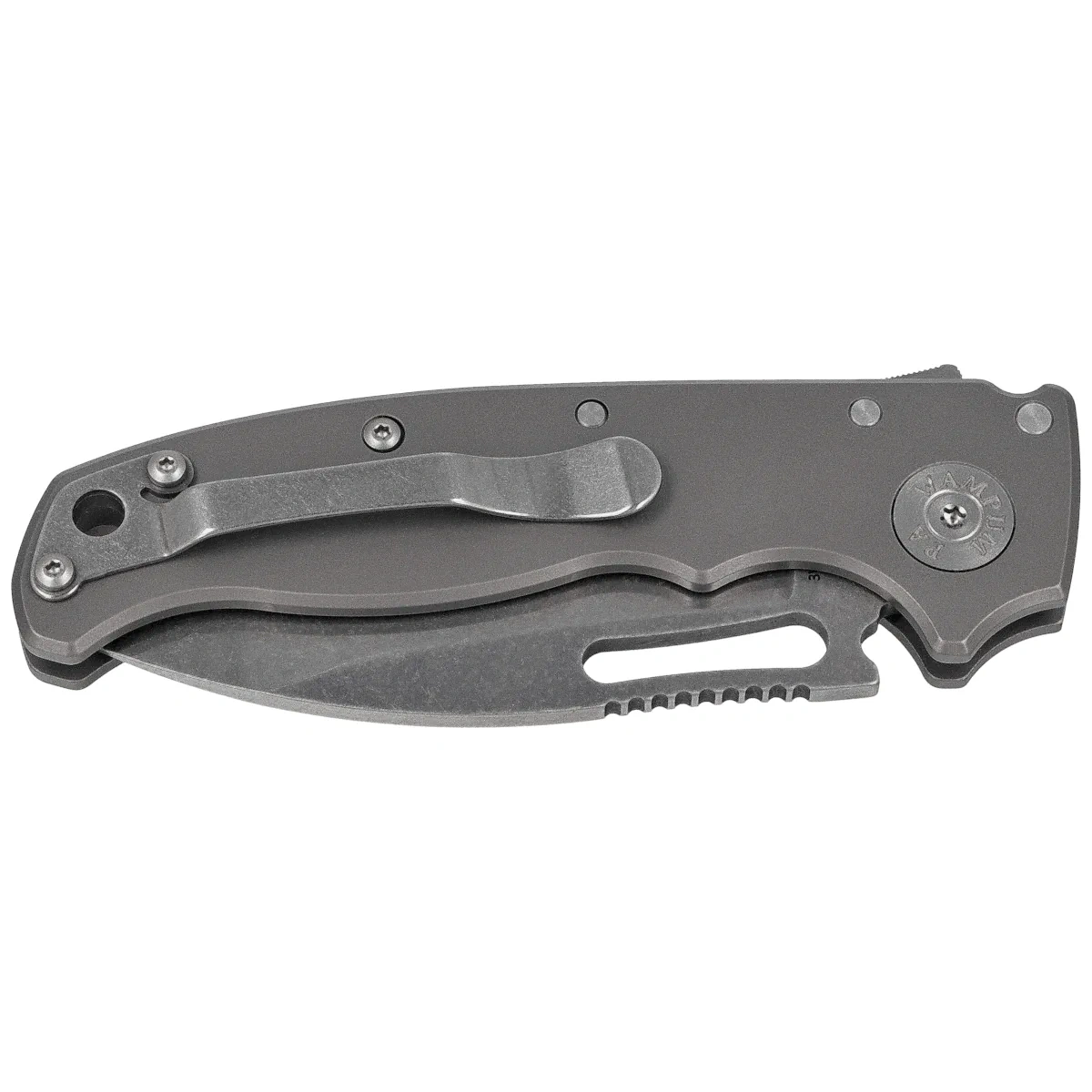 Handle - grips made of titanium, distinguished by lightness, rigidity and resistance to external conditions. Profiled undercuts promote a secure grip, even with gloves. Steel spacers increase the rigidity of the entire structure, and the deep-carry clip allows convenient and discreet carrying in the pocket. In addition, a left-side clip is included, for left-handed users. Torx-style mounting components simplify removal and servicing of the knife. The Shark-Lock™, located at the top of the Handle, works instantly, providing full control and safety, regardless of your preferred grip or dominant hand.
