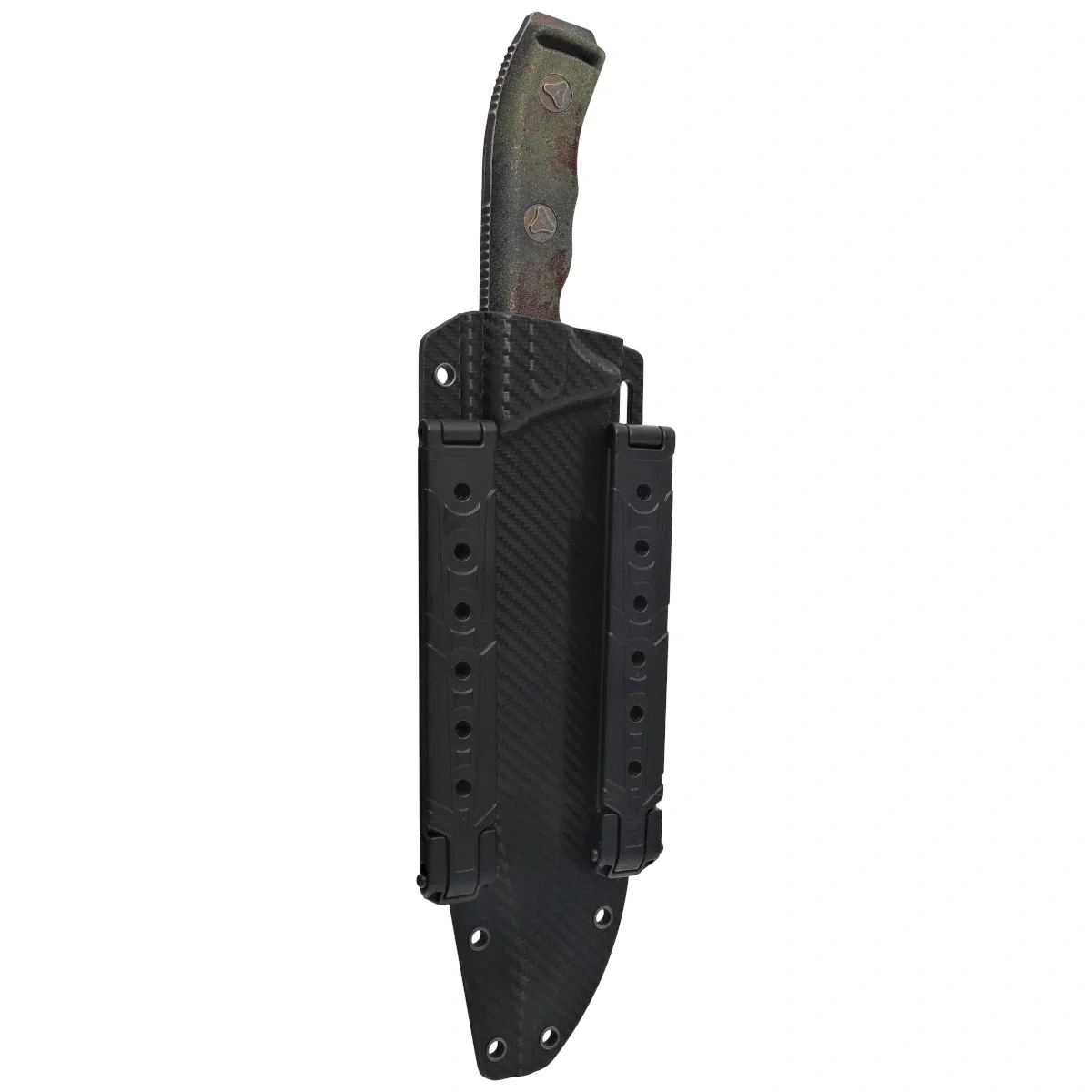 Sheath - made of carbon fiber laminated kydex, provides a secure hold on the knife in any position. The M.O.L.L.E. type attachment to the belt or to the equipment's shoulder stock allows the knife to be carried vertically or horizontally.