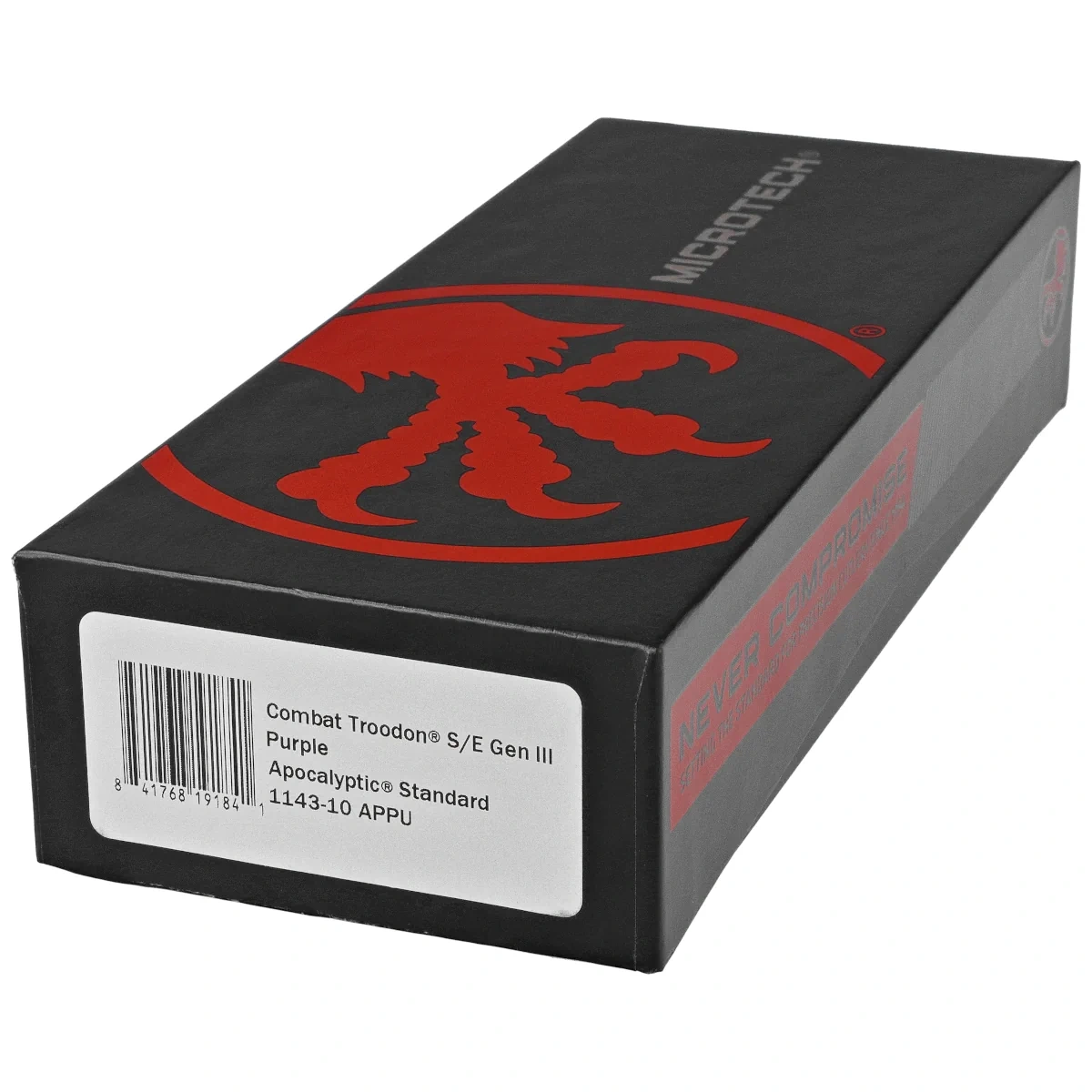 Combat Troodon Gen III S/E Purple Aluminum, Apocalyptic this largest of the automatic knives is the pinnacle of precision engineering and tactical prowess in the field of OTF (Out The Front) knives. Built for a wide range of utility applications, it boasts a 25% larger size compared to the flagship Troodon. Precisely crafted, it features a sophisticated and hellishly fast mechanism that extends the razor-sharp blade. 100% made and assembled in the USA. Designed by Anthony Marfione, knifemaker and owner of Microtech Knives.