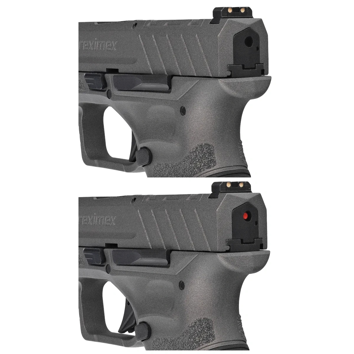 Interchangeable backstraps allow for custom grip adjustments. The pistol comes fitted with a medium backstrap and includes a larger one. Reximex backstraps are made of textured elastomer for enhanced comfort and grip security.
