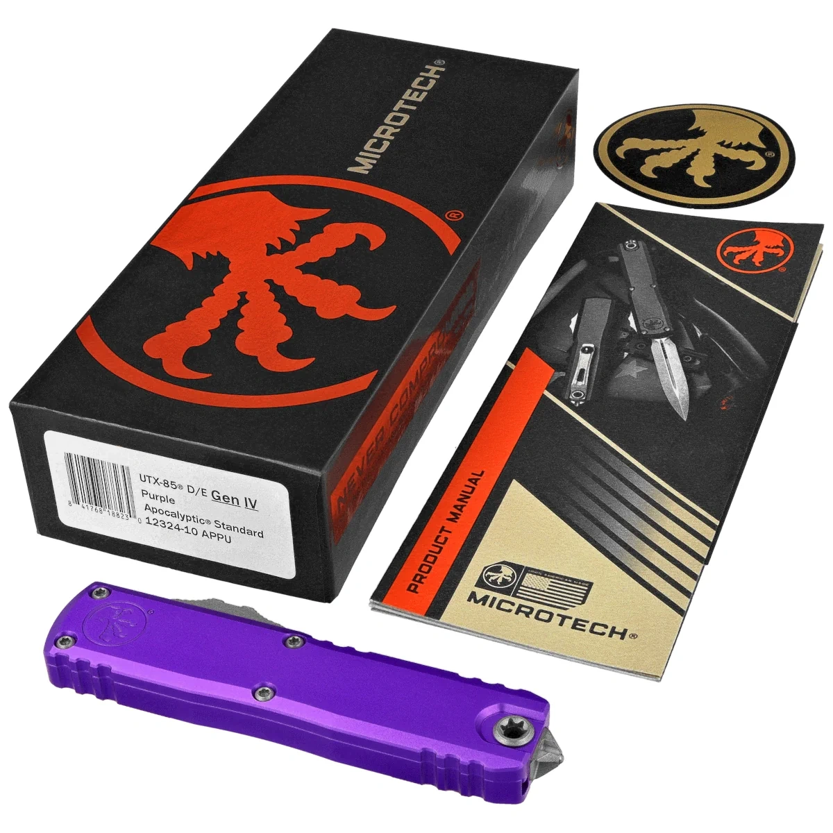 • UTX-85 Gen IV D/E Purple Aluminum, Apocalyptic is a compact OTF automatic knife from the UTX-85 series. Designed for EDC applications, it retains all the advantages of larger models. Operating in D/A mode, it features a fast blade extension mechanism.
