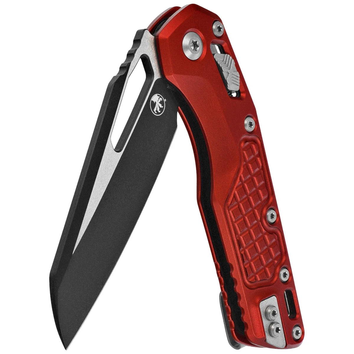 Handle - made with excellent precision in 3D technology on CNC milling machines from anodized aluminum 6061-T6. For a better grip, the surface of the Handle was covered with a characteristic texture imitating the surface of a fragmentation grenade(Frag Pattern). A wide locking slide with Microtech's characteristic stepped structure(X Button) provides secure and comfortable operation. The grips are connected by a solid aluminum backspacer. A double-sided (right/left) clip allows the knife to be carried discreetly in the tip-up position. Above the clip is a lanyard hole , which is a hole for a safety or decorative cord.