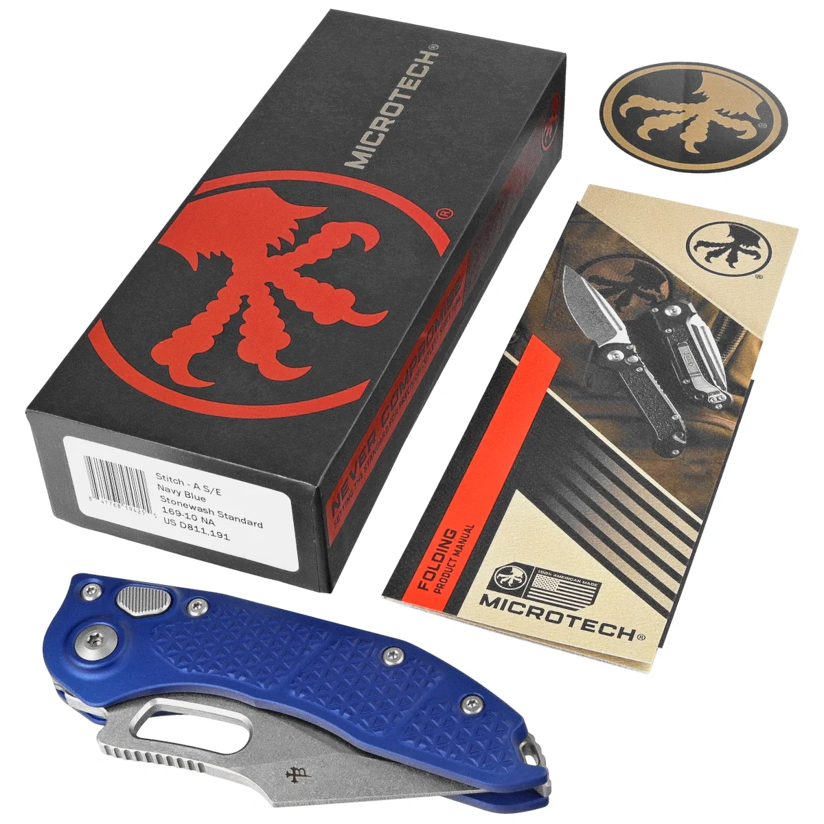 • Stitch-A S/E Navy Tri-Grip Aluminum, Stonewashed automatic version of the popular design by Sebastijan Berenjie of Borka Blades and Microtech. Wide harpoon-shaped blade, superior materials and legendary Microtech workmanship!