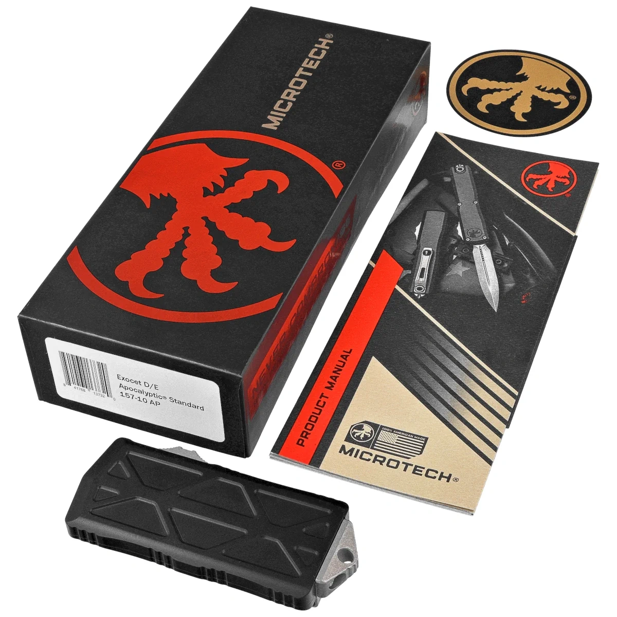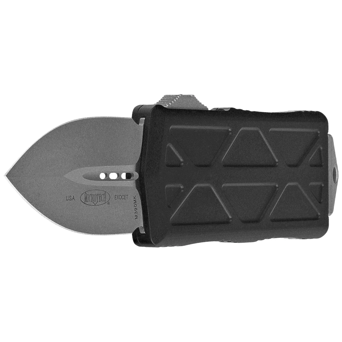 Exocet D/E Black Aluminum, Apocalyptic is a compact OTF (Out The Front) automatic knife with “Money Clip” function. Operating in D/A mode, it features a hell of a fast blade extension mechanism. 100% made and assembled in the USA. Designed by Anthony Marfione, knifemaker and owner of Microtech Knives.