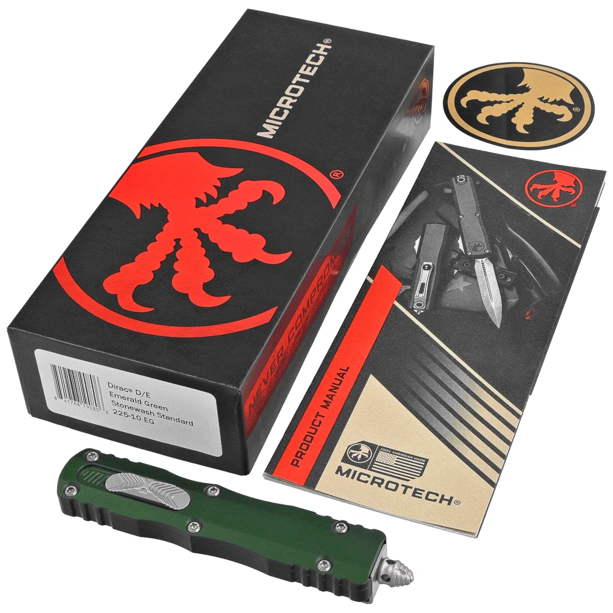 - Dirac D/E Emerald Green Aluminum, Stonewashed is a compact OTF automatic knife from the Dirac series. Operating in D/A mode, it features a hell of a fast blade extension mechanism. Slider button on the side of the handle. Designed by Tony Marfione.