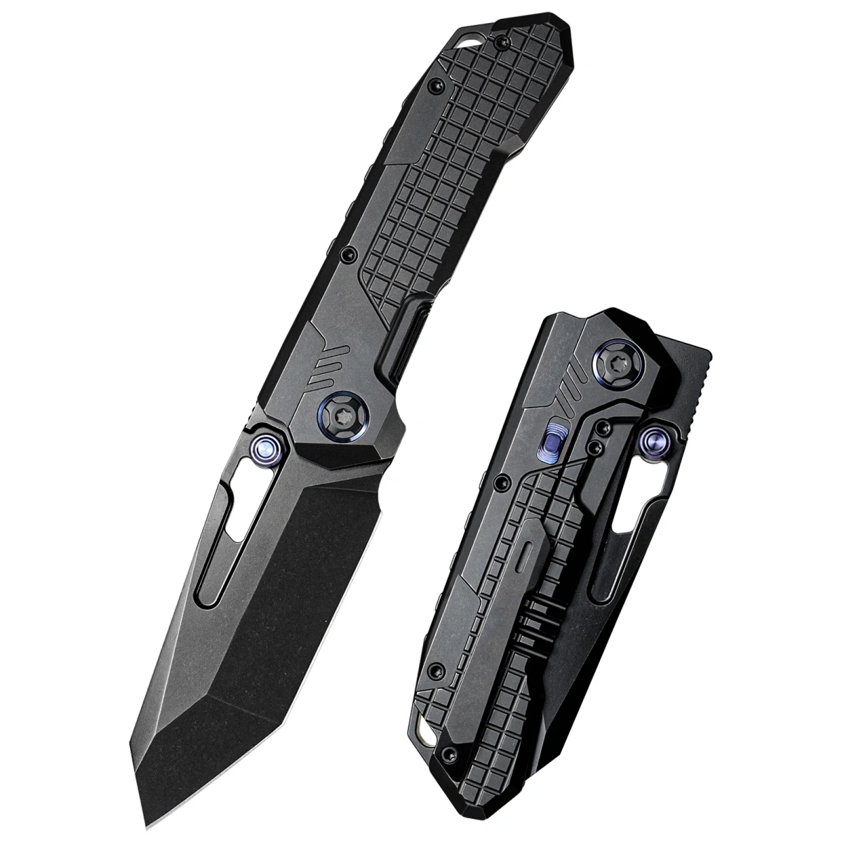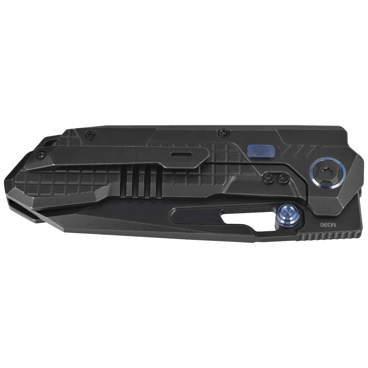 Handle - made of titanium, an integral part of the knife's construction, responsible for its rigidity, durability and grip security. Clearly marked edges, milled planes and regular surface texture improve the contact of the hand with the handle and reduce slippage, even during dynamic movements and prolonged use. The handle's profile promotes natural hand positioning, providing stability for both precision work and cuts requiring greater pressure. The design maintains a consistent balance between weight and control, which has a positive effect on the maneuverability of the knife in everyday use. The titanium clip used allows comfortable, discreet carrying and does not interfere with the ergonomics of the grip. The overall design creates a handle with an unmistakably technical character, designed for durability, reliability and comfort of long-term work.