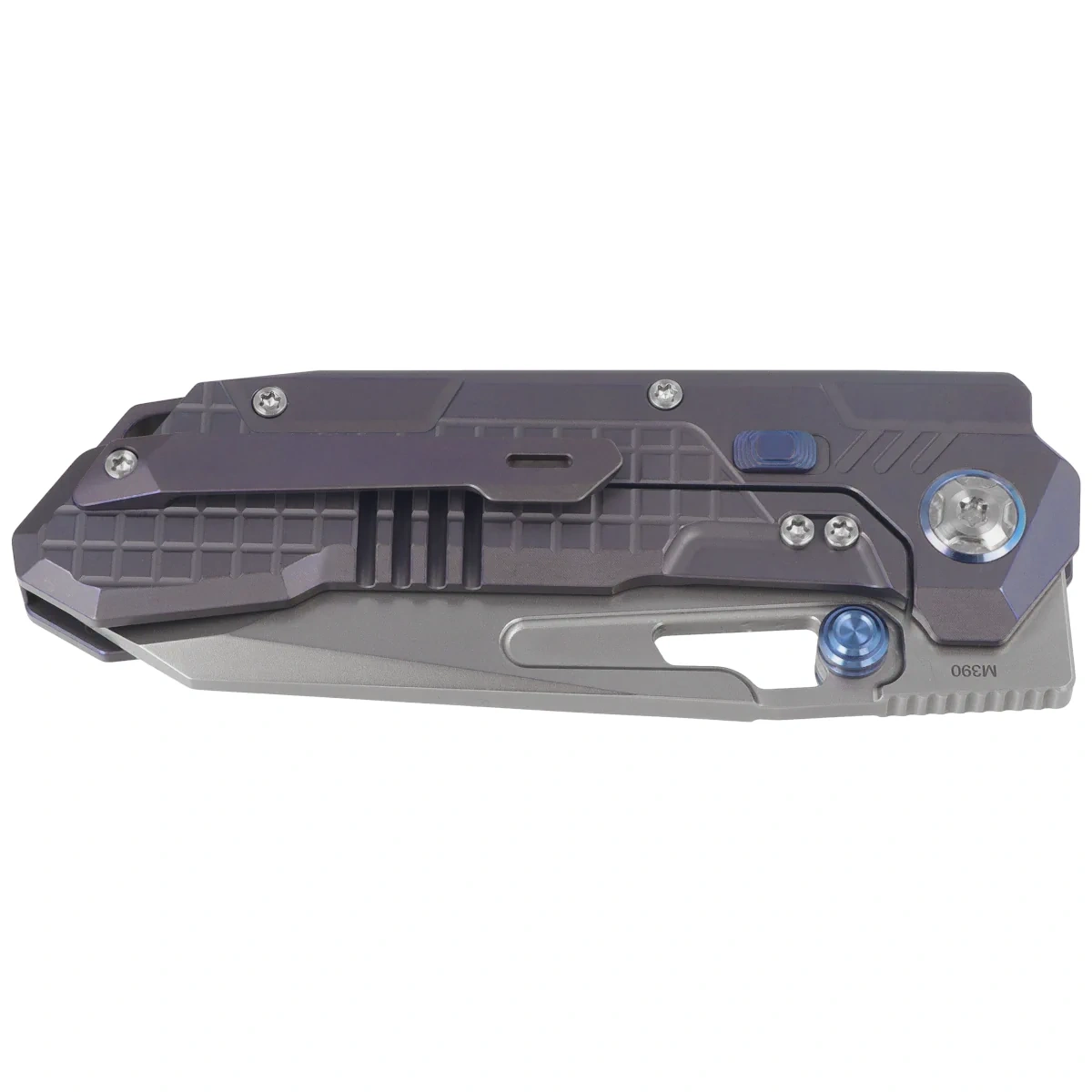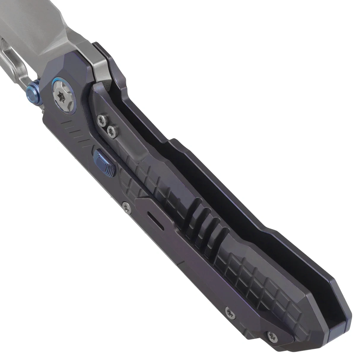 Handle - made of titanium, an integral part of the knife's construction, responsible for its rigidity, durability and grip security. Clearly marked edges, milled planes and regular surface texture improve the contact of the hand with the handle and reduce slippage, even during dynamic movements and prolonged use. The handle's profile promotes natural hand positioning, providing stability for both precision work and cuts requiring greater pressure. The design maintains a consistent balance between weight and control, which has a positive effect on the maneuverability of the knife in everyday use. The titanium clip used allows comfortable, discreet carrying and does not interfere with the ergonomics of the grip. The overall design creates a handle with an unmistakably technical character, designed for durability, reliability and comfort of long-term work.
