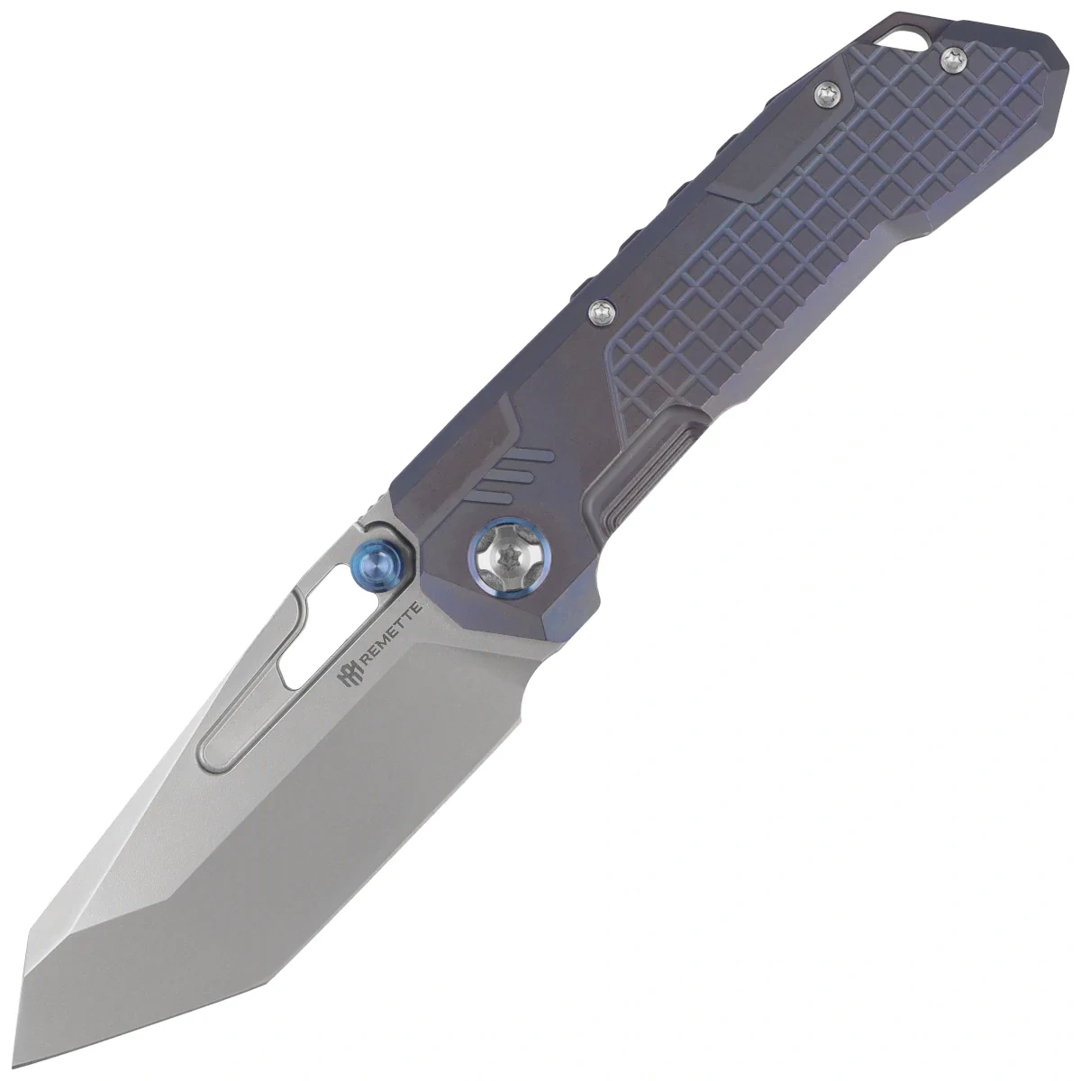 RT-Cool Leopard Grilled Blue Titanium, Pearlescent takes its place in the Remette range as a tool designed for intensive daily use, where structural rigidity, predictable operation and a high safety margin are crucial. It's a folder with a definite industrial aesthetic, stripped of decorative elements in favor of clear geometry and functional details. The entire design is subordinated to control and stability - both in the grip and during blade operation. The design unambiguously communicates the utilitarian nature of the knife, targeting the audience expecting a tool with a technical, uncompromising DNA. Blade is made of Böhler M390 steel, with a reverse tanto profile that provides a reinforced tip and high resistance to point loads. This geometry is conducive to tasks requiring precise pressure and work at the tip of the blade, while maintaining stability for more demanding applications. The flat grind used promotes smooth guidance of the blade in the material, provides good cutting control and predictable blade behavior under varying resistance. The Manual Fine Grinding Pearlescent Surface Effect finish gives the surface a subtly varied texture, reducing reflections and enhancing the technical nature of the blade. The titanium Handle is shaped for a stable, secure grip and high structural resistance. Clear planes, precision milling and textured surfaces improve control and prevent hand rotation, even when working with gloves or in less favorable conditions. The overall design maintains a balanced balance between weight and stiffness, which translates into predictable knife handling in every phase of use. As a result, the RT-Cool Leopard is a proposition for users looking for a solid premium EDC knife with increased structural strength, modern mechanics and an unambiguously tool-like character, without compromising on safety and control.