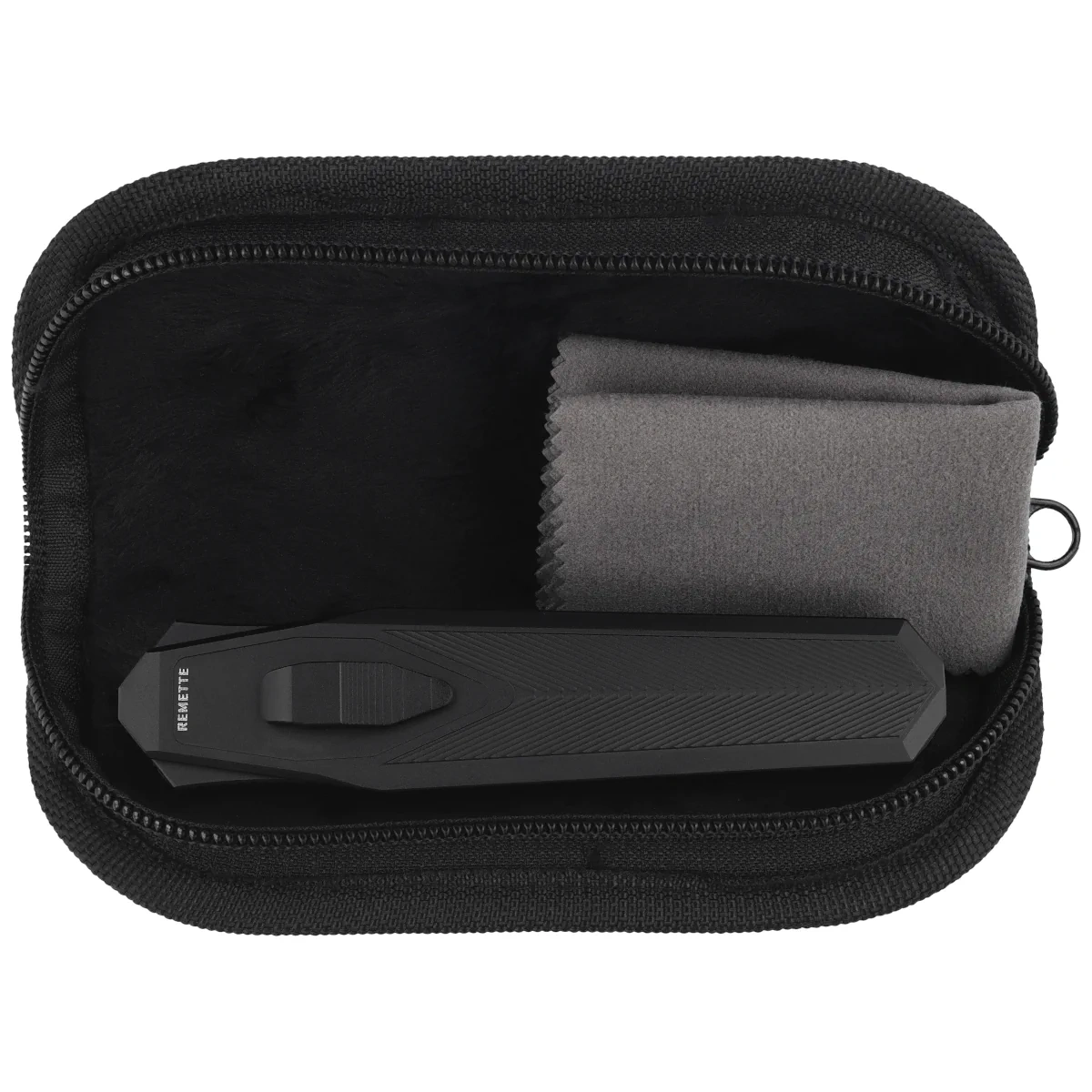 Swordfish T Black Aluminum / Copper Carbon Fiber, Titanium Black Stonewashed intuitive opening, folding knife from the Remette Knives manufactory, a display of engineering in design. Gravity OTF (Out The Front), Blade extends from the front due to the force of gravity. Modeled on the design of the Luftwaffe gravity air knife, commonly known as the knife of German paratroopers. Intuitive blade ejection / retraction with one hand (under the influence of gravity) and excellent materials such as CPM S35VN blade steel and aluminum handle, perfectly combined with the unmatched quality of the Remette brand!