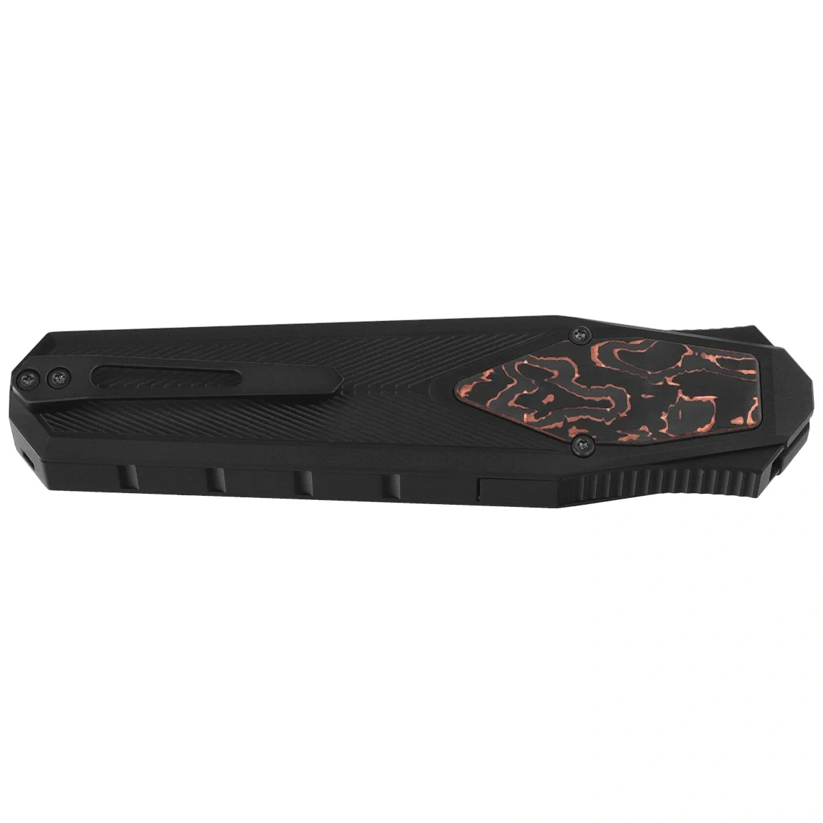 Handle - made on CNC milling machines from aluminum, with three-dimensional texture. The chamfered edges of the covers eliminate sharp edges, and the perfectly matched Copper Carbon Fiber composite inlay (inlay) adds an exclusive touch and improves grip security. On the right side, an artful slide for advancing/retracting the blade. A single-position titanium (right) deep-carry clip allows the knife to be carried discreetly in a pocket in tip-down position (blade tip down).