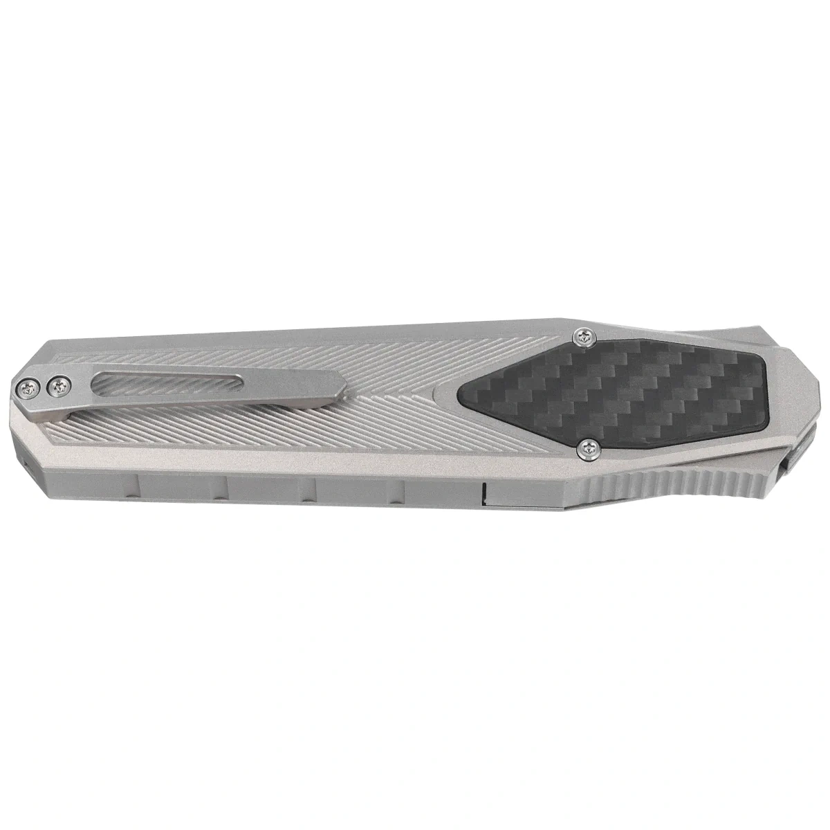 Handle - made on CNC milling machines from aluminum, with three-dimensional texture. The chamfered edges of the covers eliminate sharp edges, and the perfectly matched Carbon Fiber composite inlay (inlay) adds an exclusive touch and improves grip security. On the right side, an artful slide for advancing/retracting the blade. A single-position titanium (right) deep-carry clip allows the knife to be carried discreetly in a pocket in tip-down position (blade tip down).