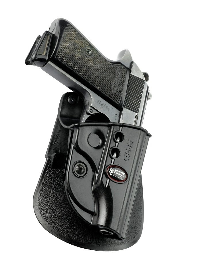 • PPND (Paddle) kabura otwarta Fobus prawa. Do Walther PP, PPK, PPKS (old). FEG 380 PMK. ND / Evolution-2 nowa generacja z dodatkową śrubą przy kabłąku regulującą siłę docisku kabury. Wpływa to na siłę z jaką broń jest trzymana w kaburze lub jest dobywana..