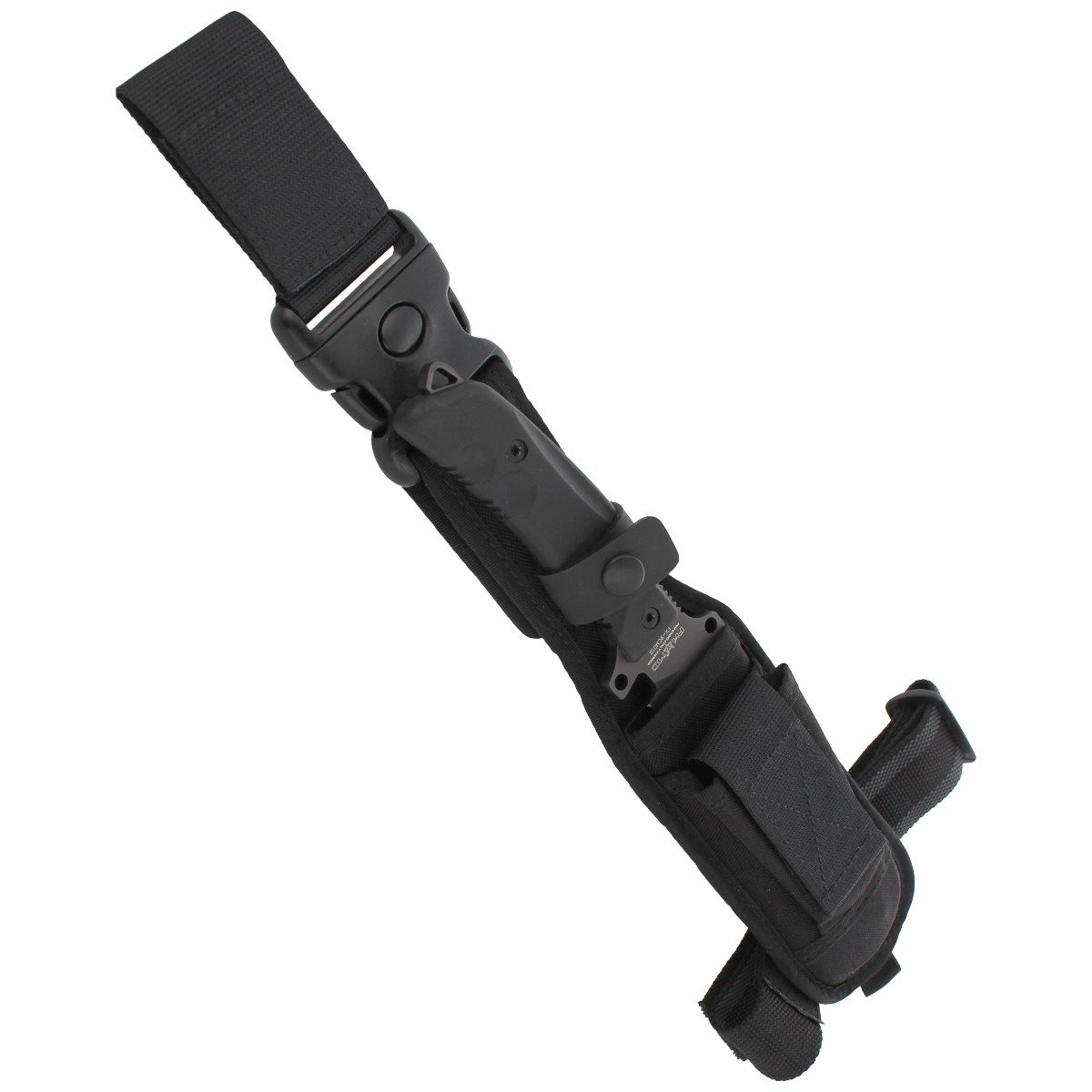 Pochwa - z dodatkową kieszenią na ostrzarkę lub krzesiwo. Wykonana z kydexu i nylonu 1000D w kolorze czarnym. Zapinana na zatrzask kabura dobrze zabezpiecza nóż przed wypadnięciem. Umożliwia mocowanie pod taśmy systemu M.O.L.L.E., lub przenoszenie na pasie. Dolna część pochwy z zapinaną na klamrę typu DuraFlex opaską udową z gumowym wzmocnieniem zapobiega przemieszczaniu się pochwy na udzie.