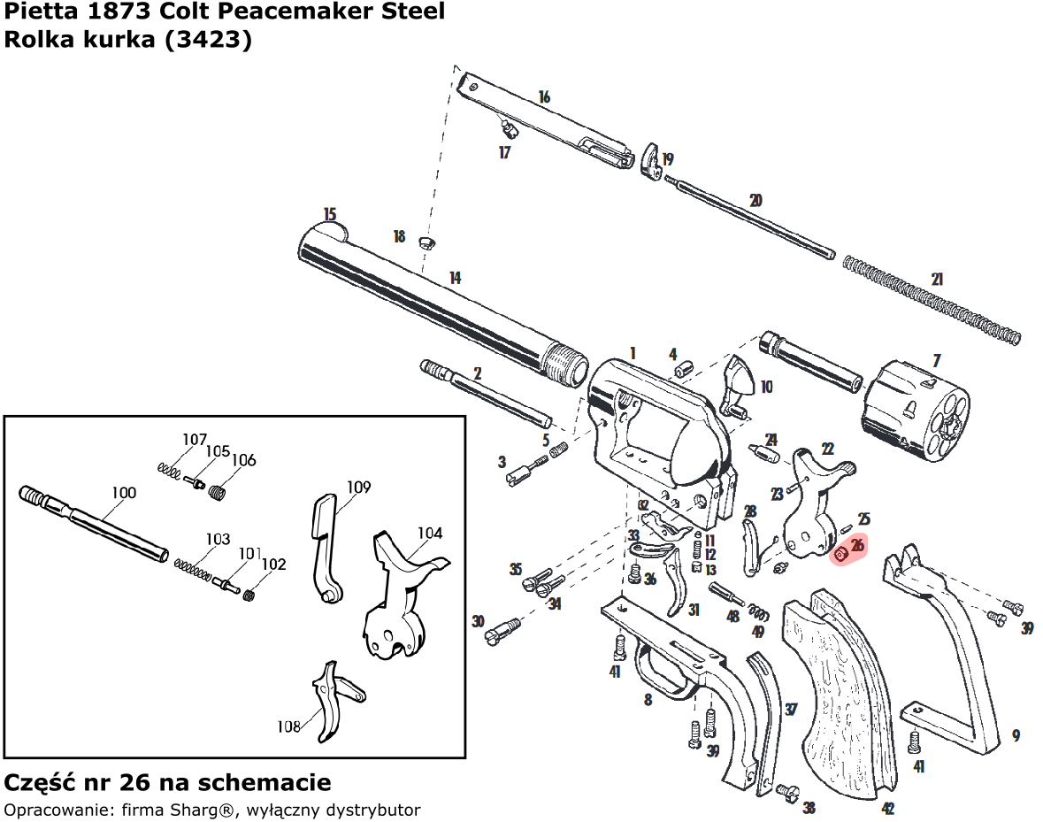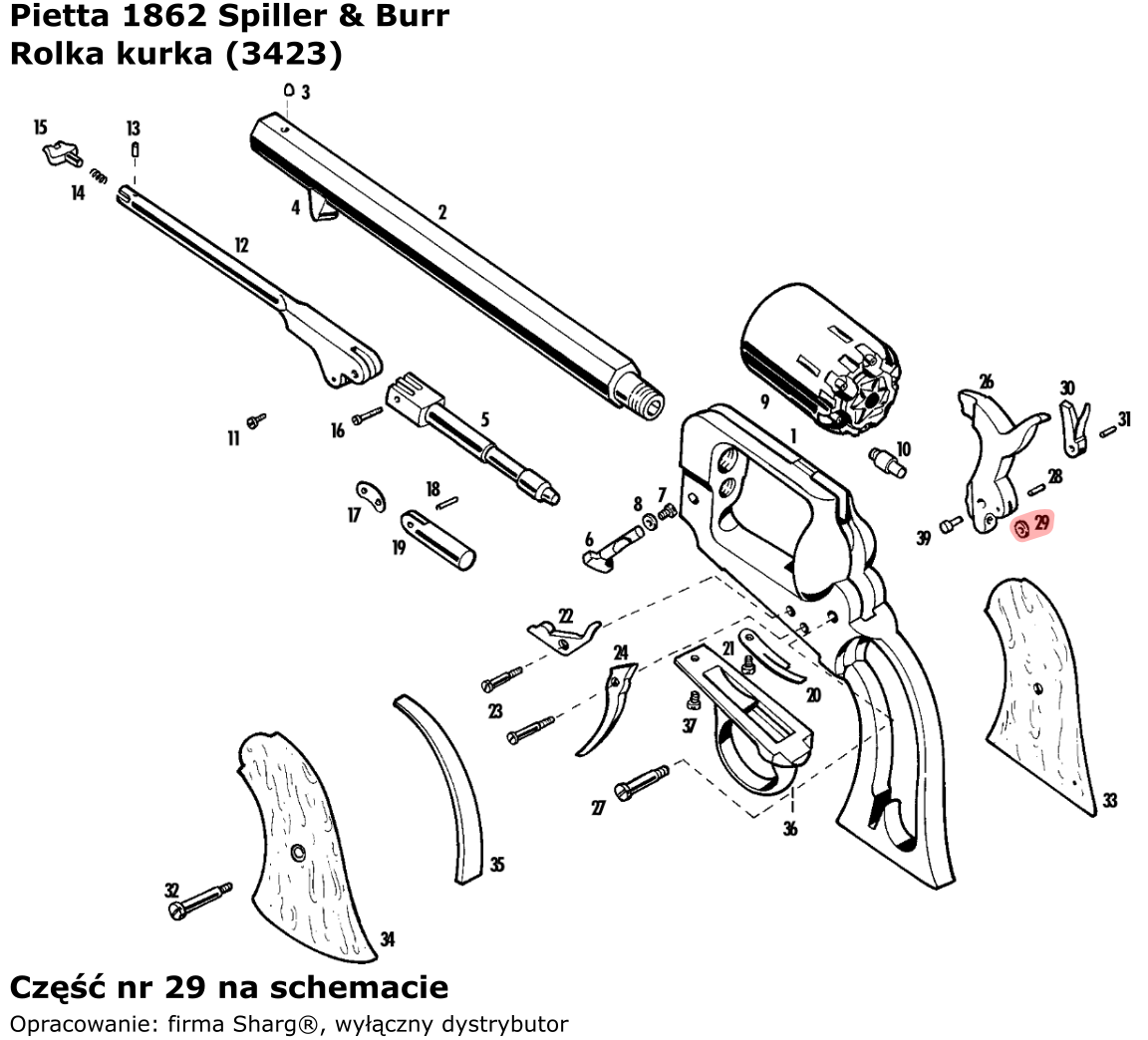 - 3423 (serwis) rolka kurka do rewolweru czarnoprochowego 1858 Remington New Model Army (.44 cal) / Navy (.36 cal) firmy Pietta. Pasuje również do modeli: 1862 Spiller & Burr, 1873 Single Action Steel, 1851 Colt Reb Nord Navy, 1860 Army oraz 1861 Navy...