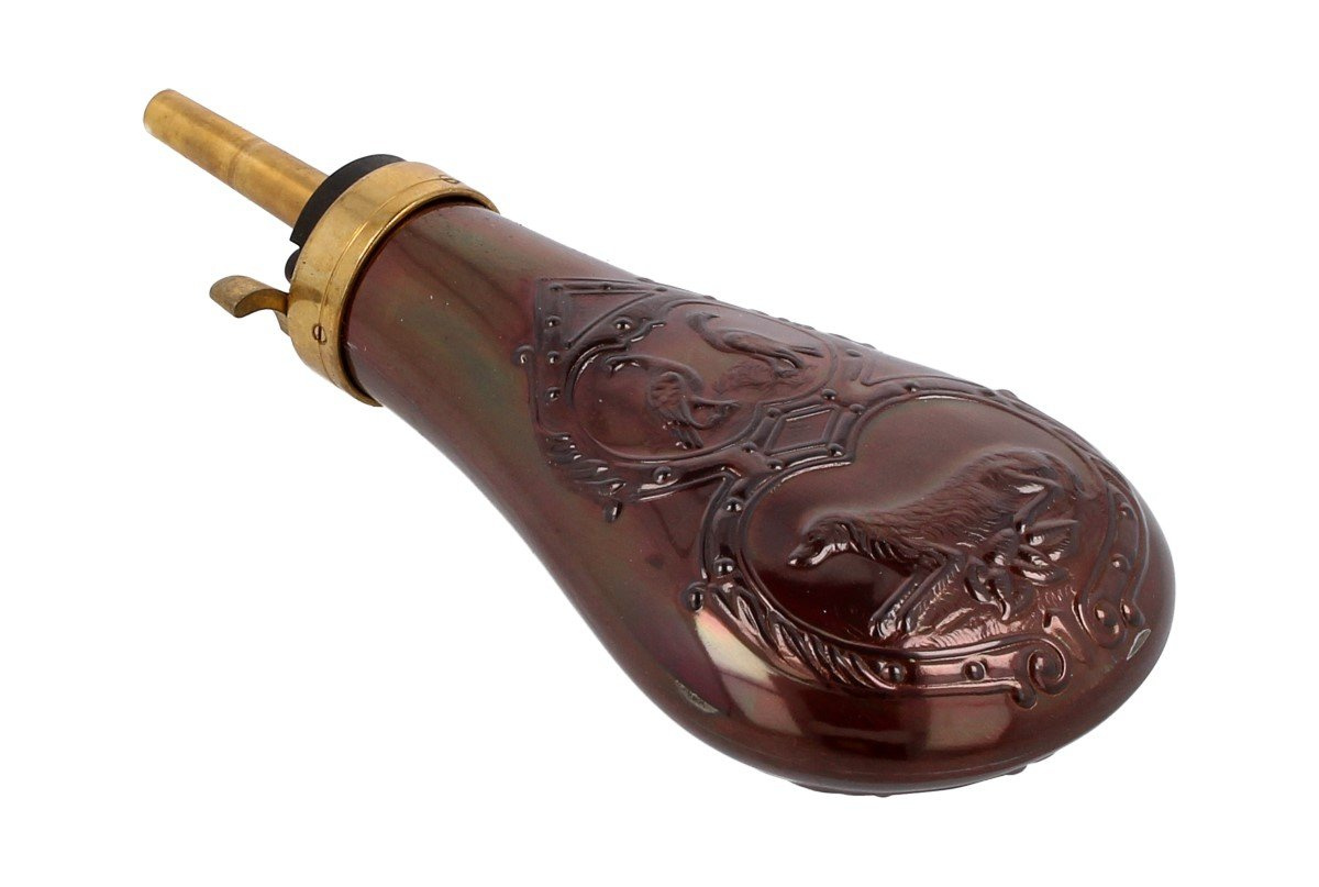 Remington Pattern Powder Flask .44 (030D529440) - prochownica z dozownikiem włoskiej firmy Davide Pedersoli. Zaprojektowana do rewolwerów czarnoporochowych Remington firmy Pietta i Uberti w kalibrze .44. Naważka prochu 24 grain. Prochownica z motywem myśliwskim przedstawiająca psa i 2 bażanty. Wykonana z lakierowanej miedzi oraz dozownikiem z mosiądzu.