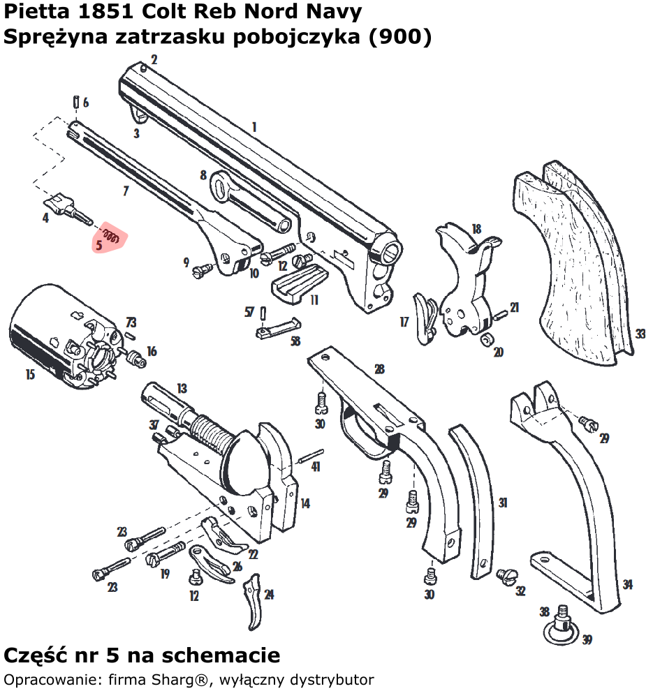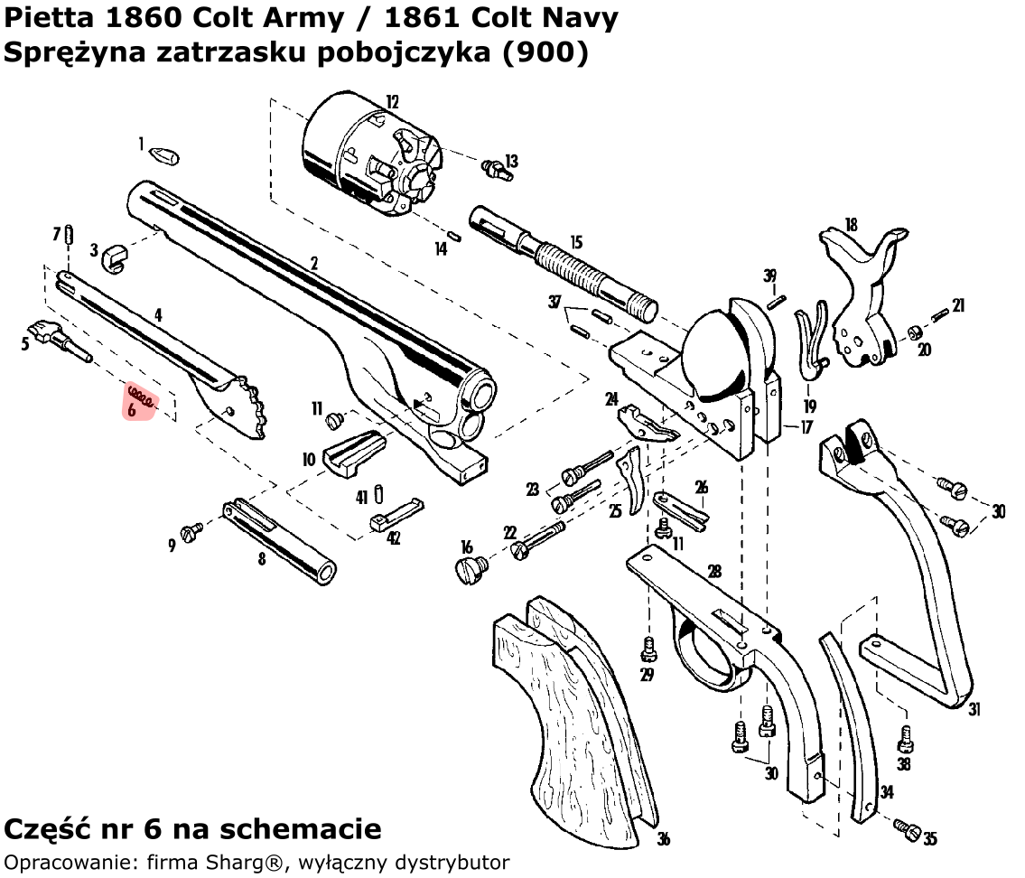 - 900 (serwis) sprężyna zatrzasku pobojczyka firmy Pietta do rewolwerów: 1851 Colt Navy, 1851 Colt REB Nord Navy w kalibrach: .36, .44. Pasuje również do modeli 1860 Army oraz 1861 Navy.