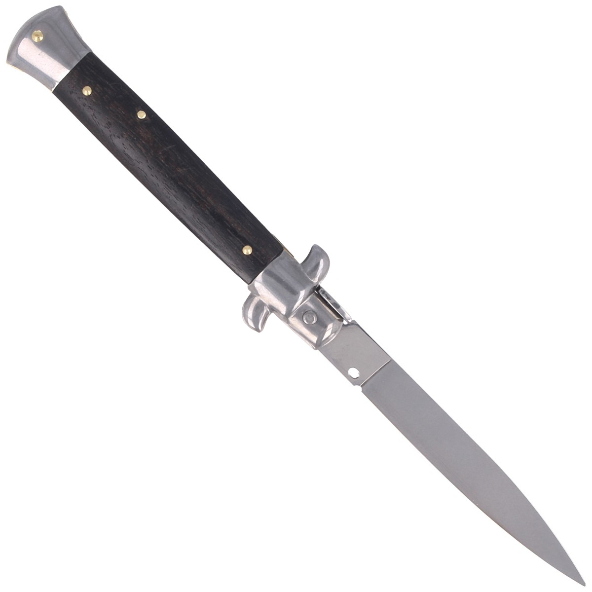 Rękojeść - łączy lite drewno hebanowe z niklowymi okuciami, tworząc kompozycję, która nawiązuje do najlepszych tradycji włoskiego stiletta. Gładka powierzchnia drewna, ciemna tonacja i precyzyjnie osadzone nity tworzą harmonijną całość. Profil chwytu zapewnia komfortową manipulację, a wyważenie konstrukcji sprzyja stabilności podczas operowania nożem. Rozmieszczenie elementów – w tym mechanizmu otwierającego – zachowuje klasyczny układ znany z ręcznie wykonywanych modeli sprzed dekad. Wybór materiałów oraz ręczna produkcja podnoszą walory estetyczne i użytkowe, czyniąc nóż zarówno praktycznym narzędziem, jak i unikatem o kolekcjonerskiej wartości.