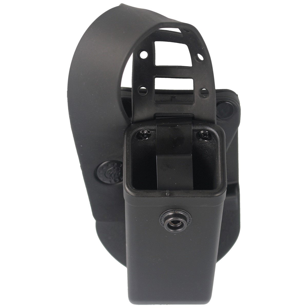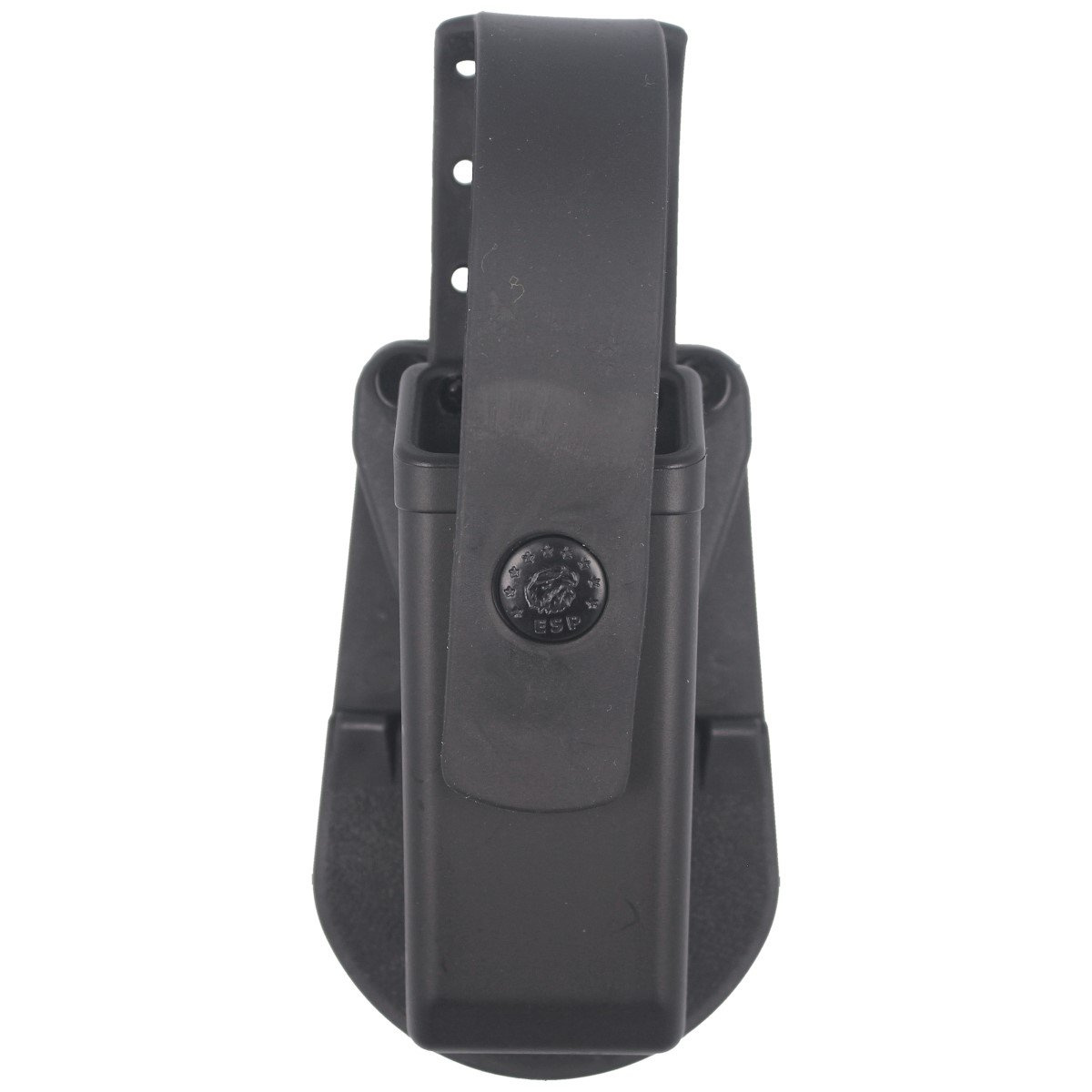 - Polimerowa ładownica z zamykaną klapką na magazynek dwurzędowy kal. 9mm/.40/.45 z mocowaniem do pasa typu Fobus Paddle w kolorze black czeskiej firmy ESP.