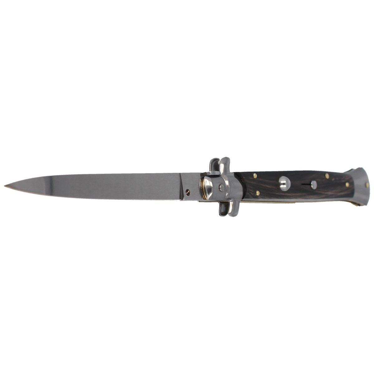 Classic Italian Stiletto Buffalo Horn Dagger 28 cm, tradycyjny włoski nóż sprężynowy, otwarcie ostrza musi odbyć w ciągu kilku setnych sekundy (cecha noży Stiletto). Całkowicie ręcznie wykonane zgodnie z zasadami włoskiego rzemiosła, noże Frank Beltrame Stiletto stały się sławne na całym świecie dzięki swej skrajnej lekkości i wytrzymałości. Dzięki swoim właściwościom, włoski sztylet jest odpowiedni do zastosowania w każdym środowisku, od polowania do biwakowania. Solidna, wytrzymała konstrukcja, mocna otwierająca głownię sprężyna, to cecha klasycznych włoskich noży sprężynowych Frank Beltrame.