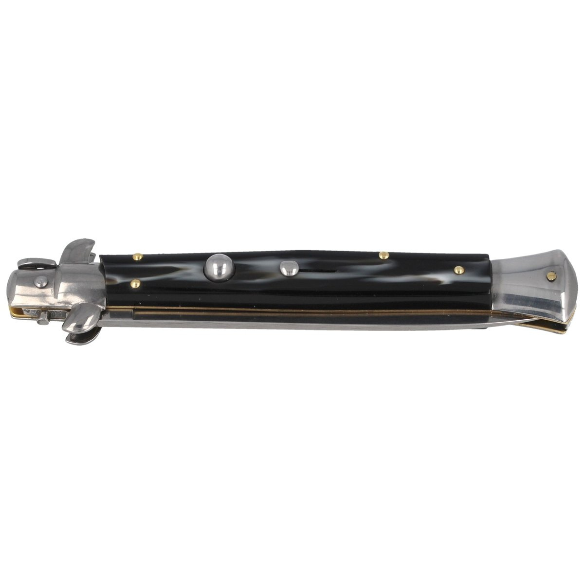 Classic Italian Stiletto Imit. Horn Dagger 28 cm, tradycyjny włoski nóż sprężynowy. Ręcznie wykonane zgodnie z zasadami włoskiego rzemiosła, noże Frank Beltrame Stiletto stały się sławne na całym świecie dzięki swej skrajnej lekkości i wytrzymałości. Dzięki swoim właściwościom, włoski sztylet jest odpowiedni do zastosowania w każdym środowisku, od polowania do biwakowania. Solidna, wytrzymała konstrukcja, mocna otwierająca głownię sprężyna, to cecha klasycznych włoskich noży sprężynowych Frank Beltrame.