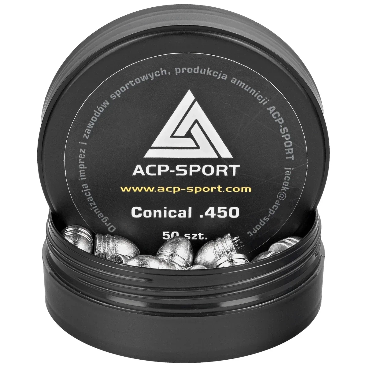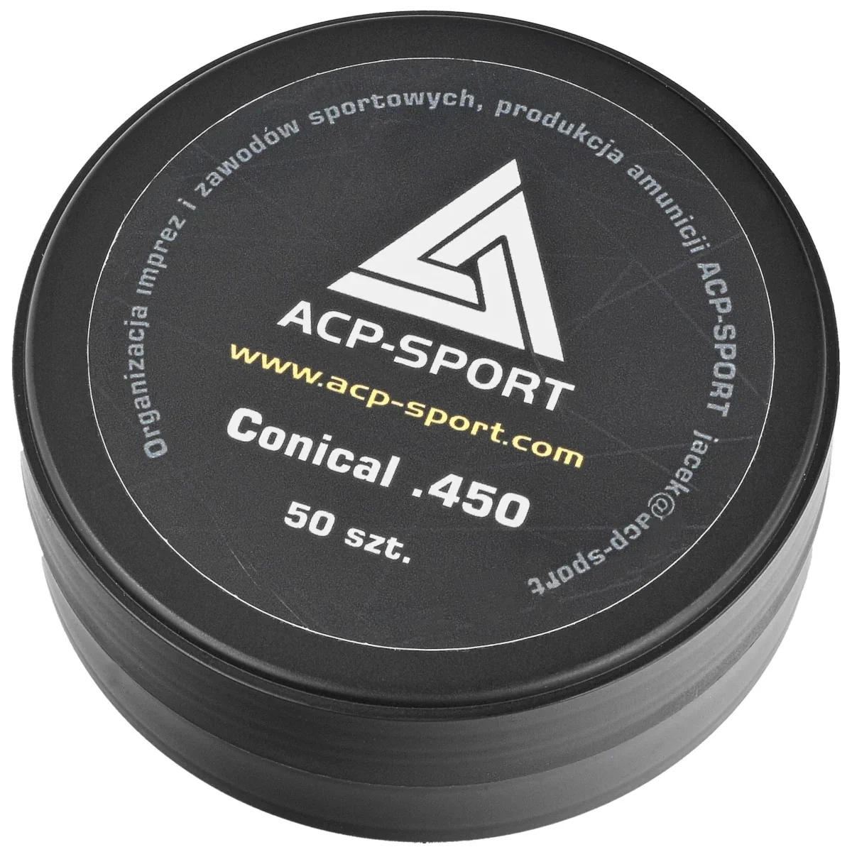 Pociski ołowiane Conical (200 gr) firmy ACP-Sport w kalibrze 450 (11.46 mm) do rewolwerów czarnoprochowych. Wykonane z czystego ołowiu bez udziału ołowionośnych materiałów wtórnych, nadlewek, niedolewek, innych wad spotykanych w produktach niższej jakości. Przeznaczone do strzelania z kapiszonowych rewolwerów m.in. Remington, Colt, pistoletów oraz karabinów czarnoprochowych w kalibrze .44. Opakowanie zawiera 50 szt.