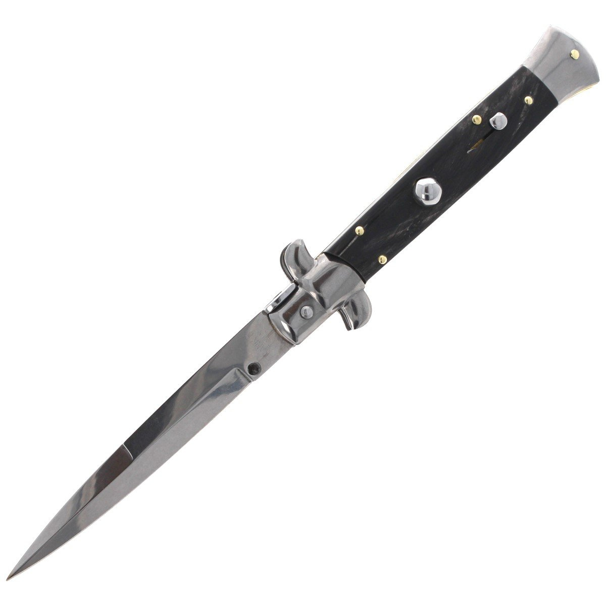 - Frank Beltrame Stiletto Bayonet Bull Horn 23cm. Tradycyjny ręcznie składany włoski nóż sprężynowy - okładziny róg bawoła. Kultowy folder podczas otwierania klingi setnych sekundy wydaje charakterystyczny klik odróżniający go od innych noży sprężynowych...