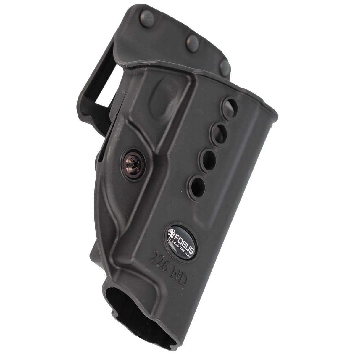 Rodzaj kabury - profesjonalna linia ND (New Design) nowej generacji kabur Fobus. Wykonane z jednego kawałka tworzywa, lekkie mimo dodatkowych funkcji. Zawierają pasek metalu wzmacniający nity mocujące kaburę z płetwą co poprawia wytrzymałość oraz niezawodność. Redukcję wagi osiągnięto poprzez zastosowanie otworów na powierzchni kabury. Seria ND posiada dodatkową śrubę przy kabłąku umożliwiającą indywidualne dostosowanie siły docisku kabury. Regulacja wpływa na siłę z jaką broń jest trzymana w kaburze oraz z jaką siłą jest dobywana z kabury. Niski profil ułatwia ukrycie broni, zwiększając komfort przenoszenia.
