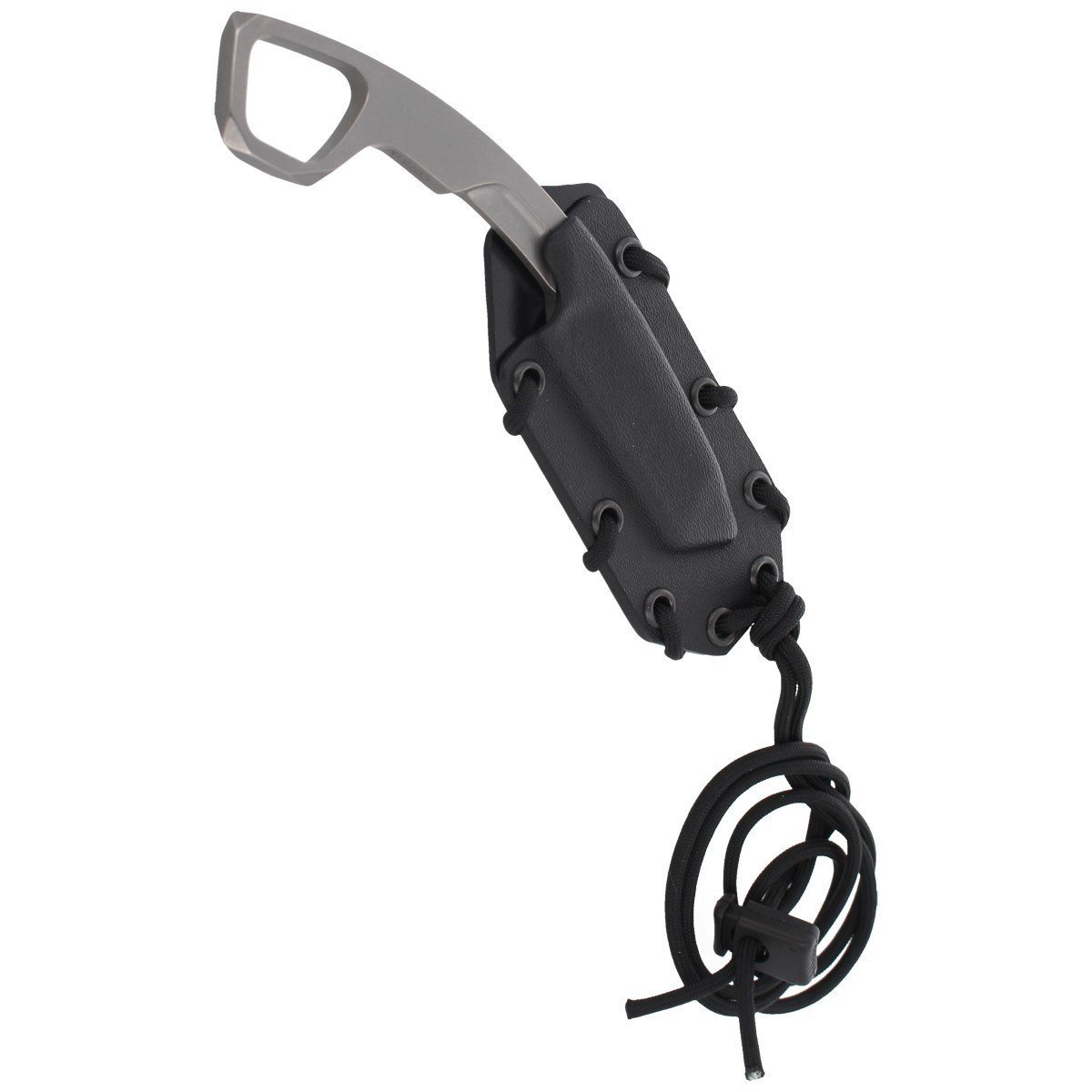 N.K.3 K SW kompaktowy Neck Knife ze stałą klingą z wykończeniem Stone Washed i rękojeścią zakończoną pierścieniem na palec. Pochwa przystosowana do zawieszania na szyi, kamizelce, innej kaburze lub opcjonalnie na pasie. Nóż o imponującej skuteczności zadawanych cięć, stosowany do samoobrony, jak i do drobnych precyzyjnych prac.