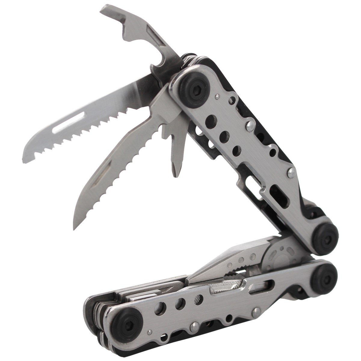 - Wykonany ze stali nierdzewnej solidny multi tool niemieckiej marki Herbertz Solingen posiada komplet niezbędnych narzędzi w tym wielofunkcyjne kombinerki. Dzięki etui można go mieć zawsze pod ręką na strzelnicy, w pracy, w domu, na wyprawie survivalowej