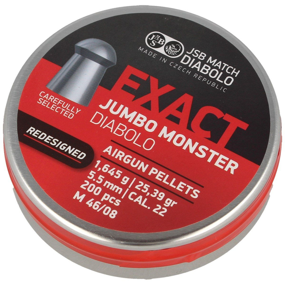 - Exact Jumbo Monster ReDesigned dzięki nowemu kształtowi uzyskano lepszą precyzję i celność. Ciężki nadkalibrowy 5.52mm śrut JSB. Wagę dobrano tak że pasuje do karabinów o największej mocy. Stabilny tor lotu przy 50J+ i przy 70J+. Numer 1 do wiatrówek FAC.
