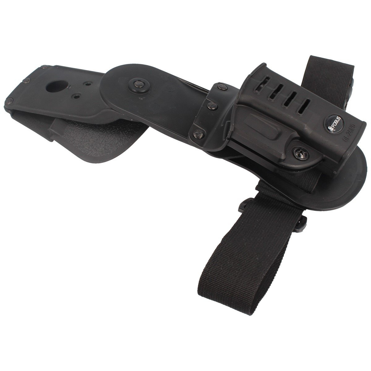 - GL-26 ND EX (Thigh Rig) kabura otwarta Fobus na platformie udowej, prawa. Glock 26, 27. ND / Evolution-2 nowa generacja z dodatkową śrubą przy kabłąku regulującą siłę docisku kabury. Wpływa to na siłę z jaką broń jest trzymana w kaburze lub jest dobywana