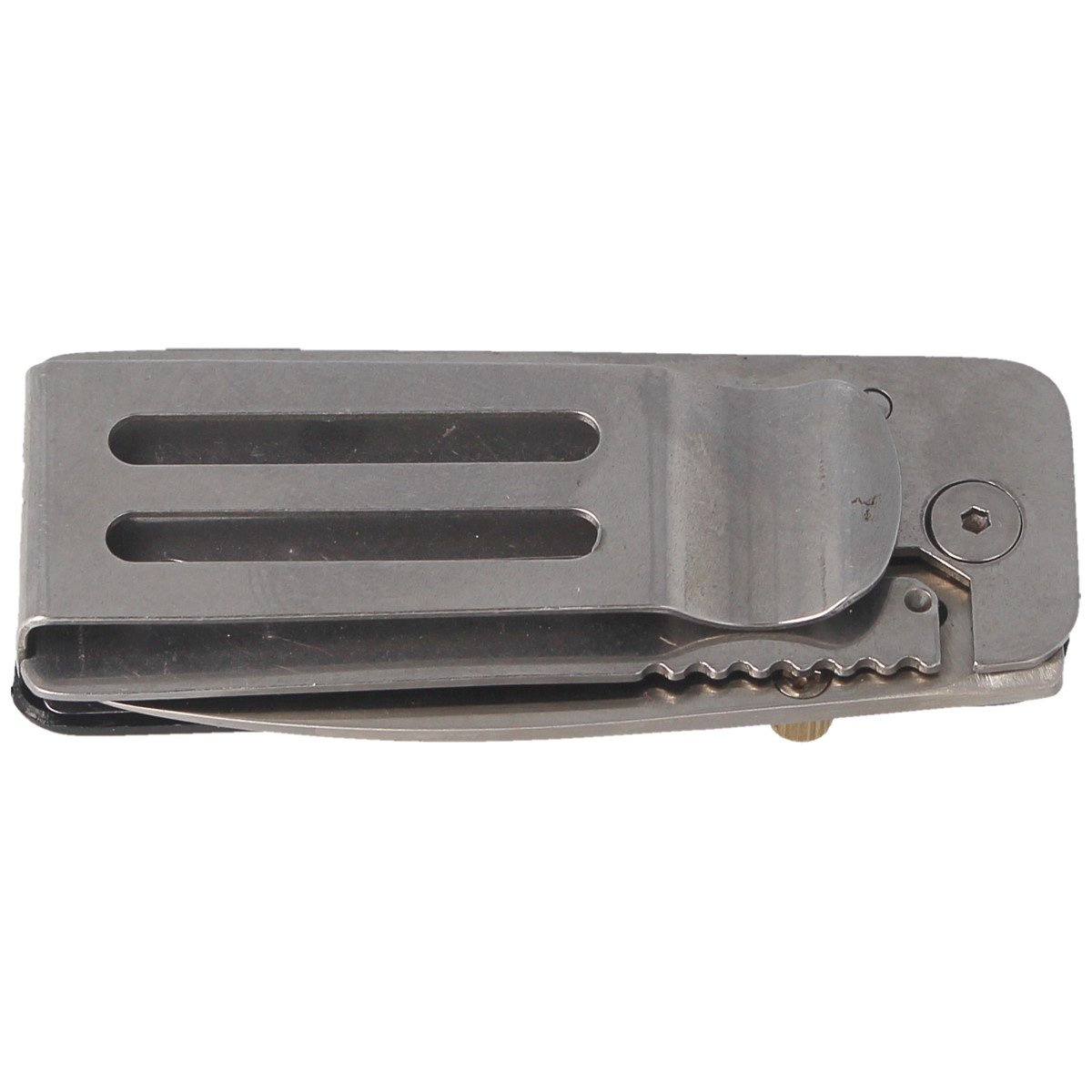Rękojeść - asymetryczna, wykonana z aluminium prawa okładzina z motywem pająka, lewa w całości ze stali nierdzewnej. Szeroki metalowy klips pozwala przenosić nóż w pozycji tip-down (czubkiem ku dołowi), może być używany jako klips do spinania banknotów.