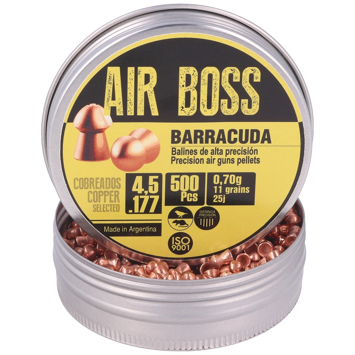- Air Boss Barracuda Copper .177 selekcjonowany sztuka po sztuce śrut w kal 4,5mm o współczynniku balistycznym BC 0.032. Polerowany i utwardzany miedzianą powłoką ułatwiającą uzyskanie wyższych o 20% prędkości i celności. Na zawody i do polowań. Opak 500szt