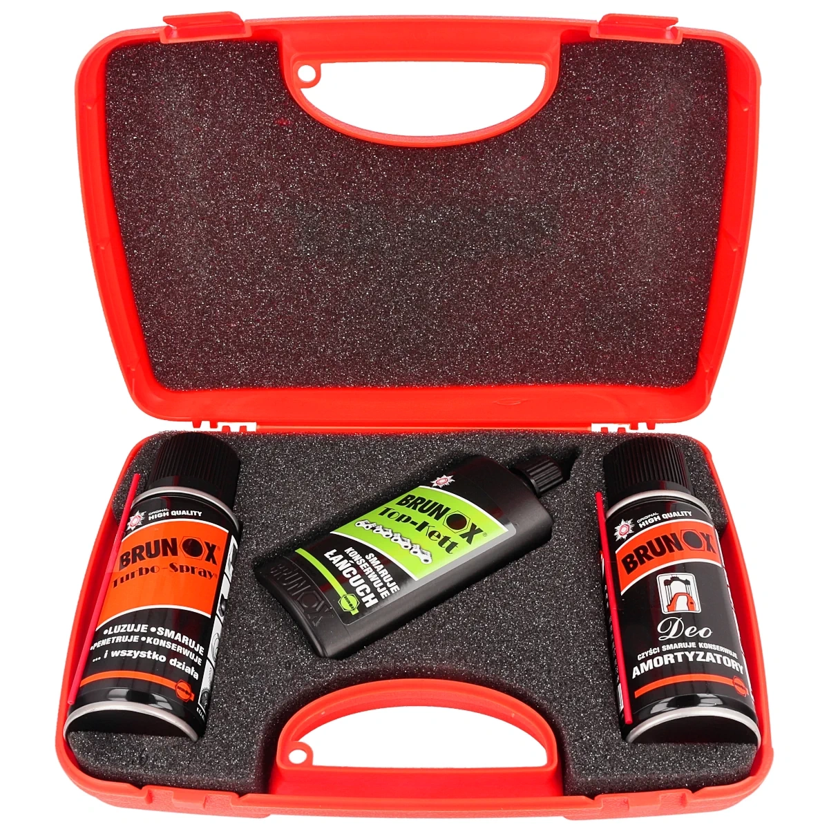 • ZESTAW ROWER1, zestaw trzech środków do konserwacji roweru: Brunox Deo, Brunox Top-Kett oraz Brunox Bike Fit. W komplecie ściereczka do czyszczenia. Całość zapakowano w polimerową walizkę z logo firmy Brunox.