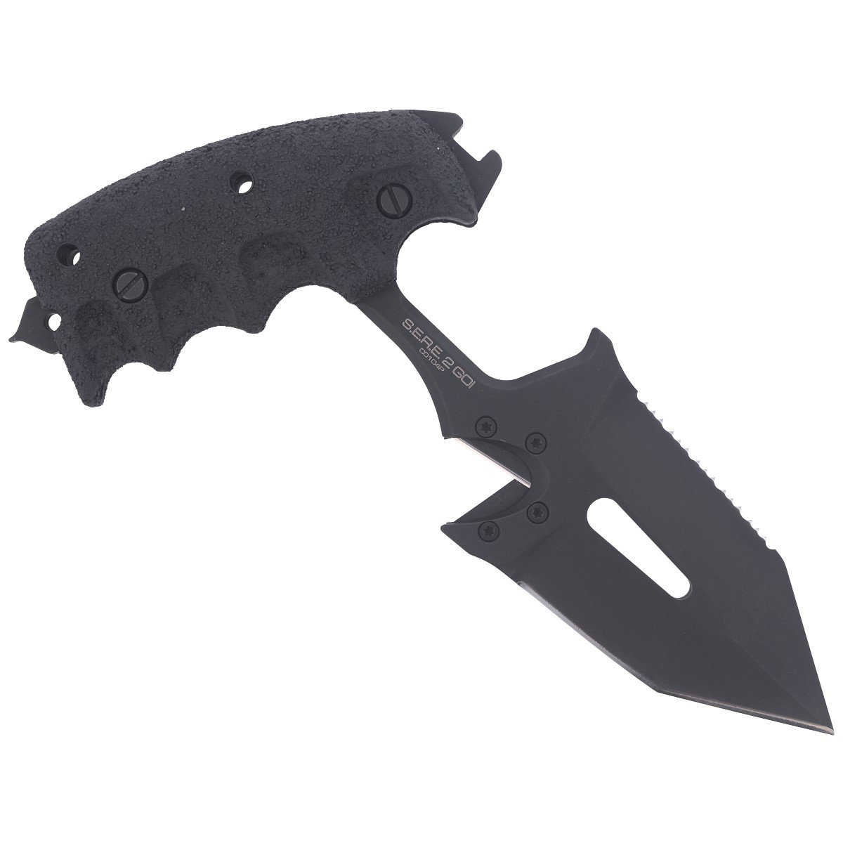 Głownia - geometryczny trójkątny profil dagger, z mocnym czubkiem do przebijania. Pełny płaski szlif to doskonałe cięcie dolnej krawędzi tnącej. Na grzbiecie klingi zostało ząbkowane ostrze do cięcia lin czy drewna. Za głównym ostrzem mamy zagłębienie, w którym zamocowano dwa wymienne ostrza. Dostajemy wtedy dodatkowe narzędzie do cięcia pasów czy fałów. Stal dla dodatkowego zabezpieczenia przed korozją pokryto czarną powłoką MIL-C-13924 na bazie teflonu.