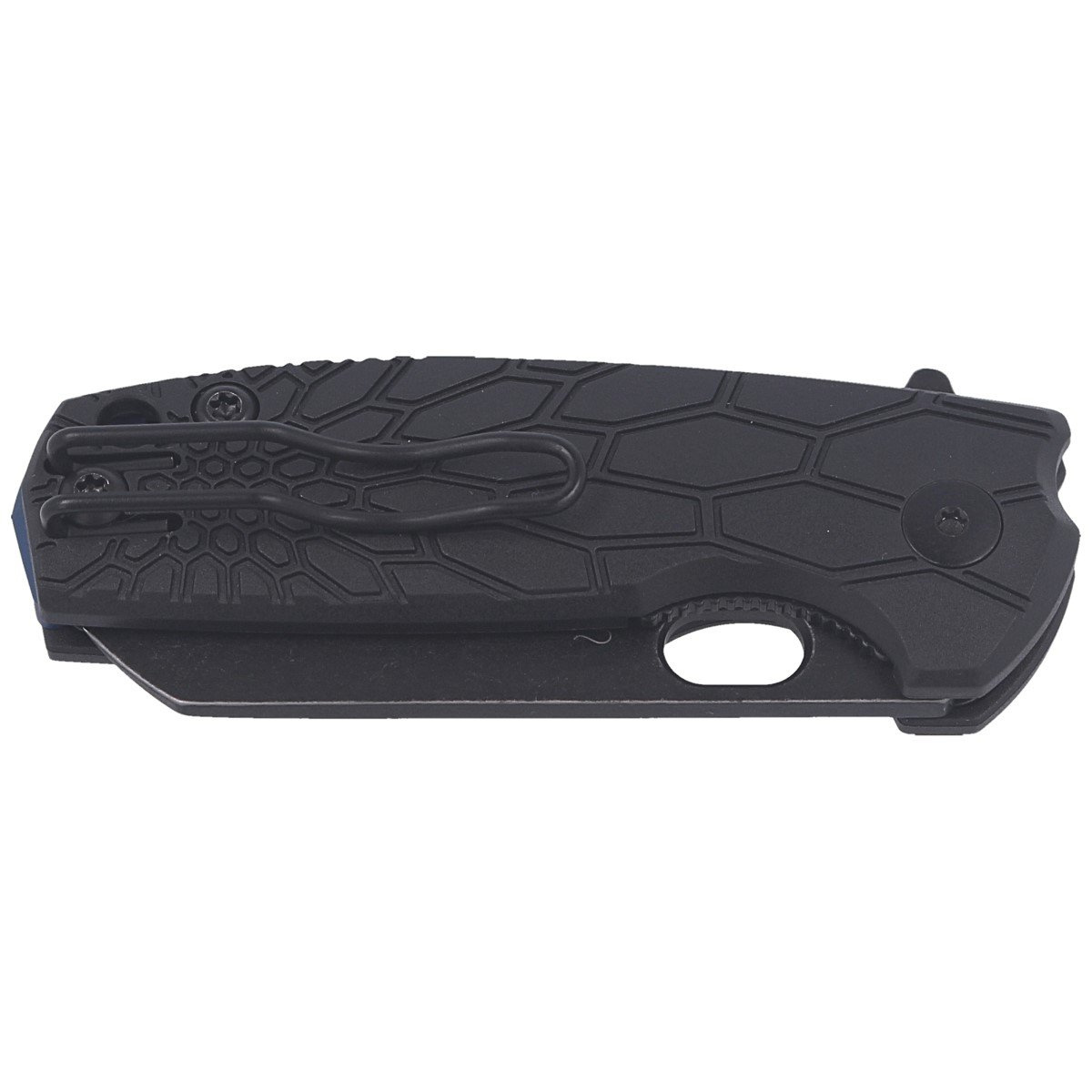Rękojeść to gładkie okładziny z czarnego FRN (Fiberglass Reinforced Nylon) przykręcone do aluminiowego backspacera co oznacza praktyczną niezniszczalność takiej konstrukcji. Klips typu deep carry, dwupozycyjny (lewa/prawa) wykonany w znanej np z noży Spyderco lekkiej formie formowanego drutu (wireclip), umożliwia przenoszenie noża w pozycji tip-up. Nad klipsem umieszczono lanyard hole czyli otwór na linkę asekuracyjną lub ozdobną.
