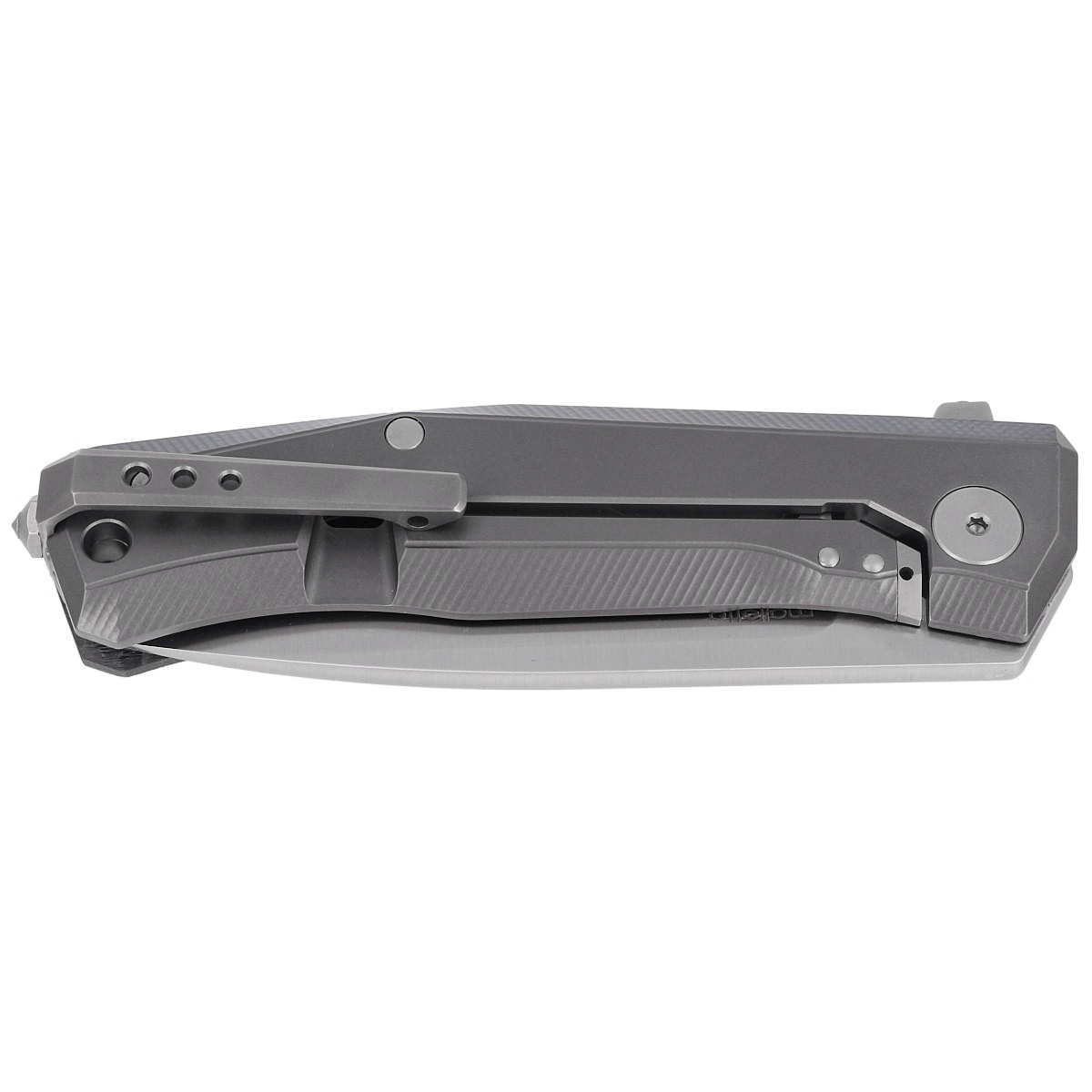 Rękojeść - asymetryczna z podwójnie frezowanego litego tytanu 6AI-4V, będącego podstawą mechanizmu blokującego klingę oraz włókna węglowego carbon fiber. Okładziny zamocowano do tytanowej przekładki dystansowej backspacera / łącznika okładzin. Otwarta konstrukcja tzw. open-backed zmniejsza wagę oraz upraszcza czyszczenie. Tytanowy Solid® klips pozwala przenosić nóż w pozycji tip-up (czubkiem do góry). Przykręcony do tytanowej ramy za pomocą śruby / zbijaka do bicia szkła wykonanego z węglika wolframu. W tylnej części okładzin lanyard hole, otwór na linkę.