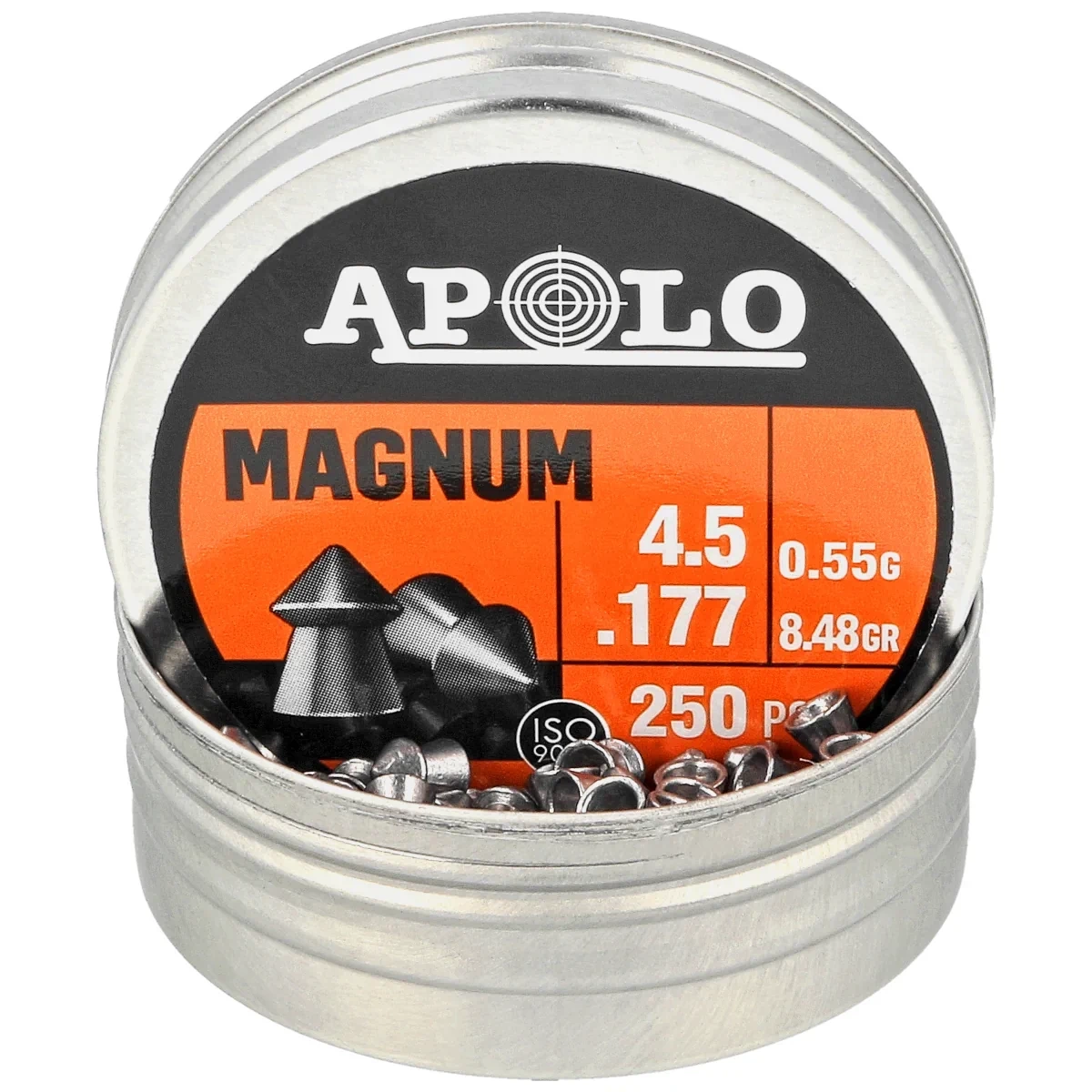 Magnum .177 ciężki śrut w kalibrze 4.5 mm o współczynniku balistycznym (Ballistic Coefficient) BC: 0.015. Ze względu na swoją masę charakteryzuje się silnym rozpłaszczeniem po trafieniu w cel oraz celnością - świetnym skupieniem. Łączy w sobie aerodynamikę śrutu Domed ze zdolnością penetracji śrutu Point. Amunicja klasy Premium argentyńskiej firmy Apolo w doskonałej cenie. Pakowane w zakręcane metalowe pudełko 250 szt. Bestseller!