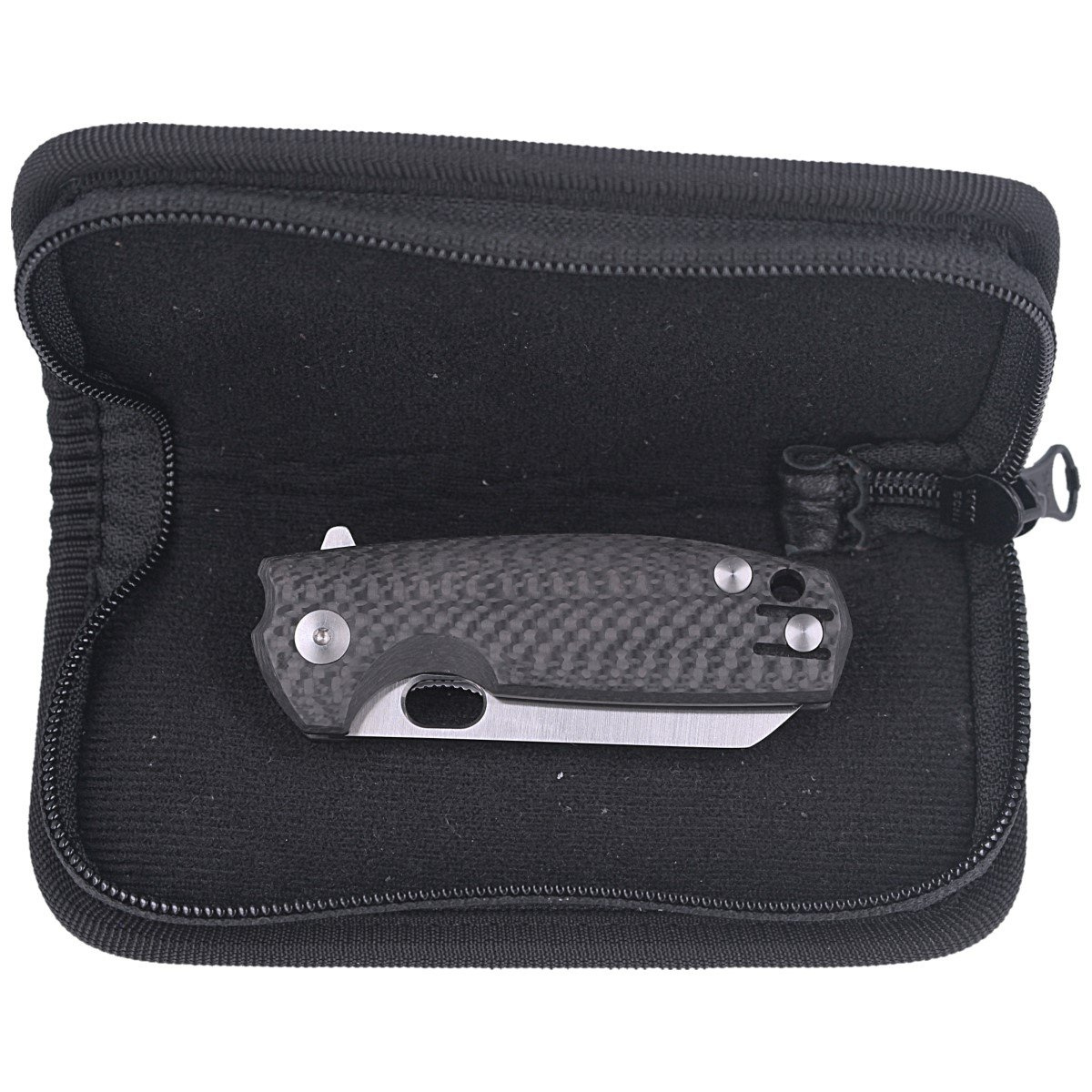 Rękojeść to gładkie okładziny z czarnego Carbon Fiber przykręcone do carbonowego backspacera co oznacza praktyczną niezniszczalność takiej konstrukcji. Klips typu deep carry, dwupozycyjny (lewa/prawa) wykonany w znanej np z noży Spyderco lekkiej formie formowanego drutu (wireclip), umożliwia przenoszenie noża w pozycji tip-up. Nad klipsem umieszczono lanyard hole czyli otwór na linkę asekuracyjną lub ozdobną.