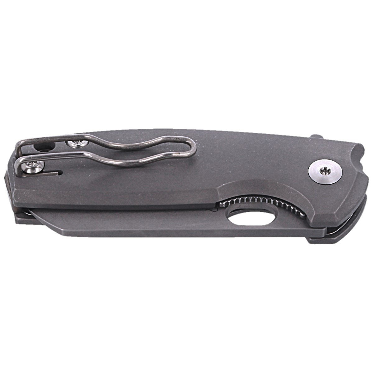 Rękojeść to gładkie, wykończone stonewashem okładziny z tytanu przykręcone do tytanowego backspacera co oznacza praktyczną niezniszczalność takiej konstrukcji. Klips typu deep carry, dwupozycyjny (lewa/prawa) wykonany w znanej np z noży Spyderco lekkiej formie formowanego drutu (wireclip), umożliwia przenoszenie noża w pozycji tip-up. Nad klipsem umieszczono lanyard hole czyli otwór na linkę asekuracyjną lub ozdobną.