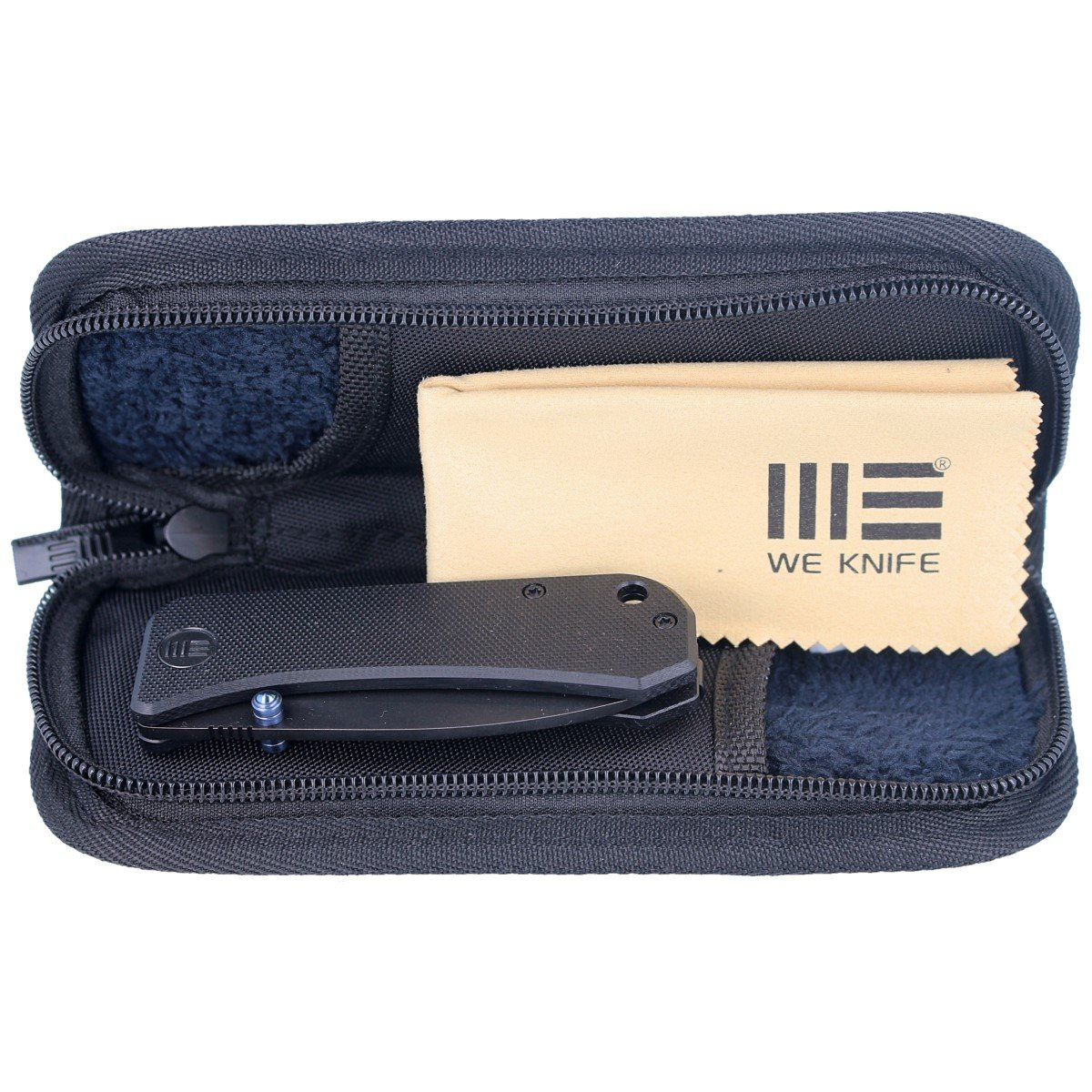Rękojeść - moletowane czarne kawałki tworzywa G10. Otwarta konstrukcja tzw. open-backed mocowana do siebie stalowymi tulejami dystansowymi zmniejsza wagę oraz ułatwia czyszczenie. Oś pivota zdobi stylizowane logo marki WE. Prawostronny, jednopozycyjny metalowy klips deep carry pozwala przenosić dyskretnie nóż w kieszeni w pozycji tip-up (ostrzem do góry). Z tyłu rękojeści lanyard hole, otwór na linkę.