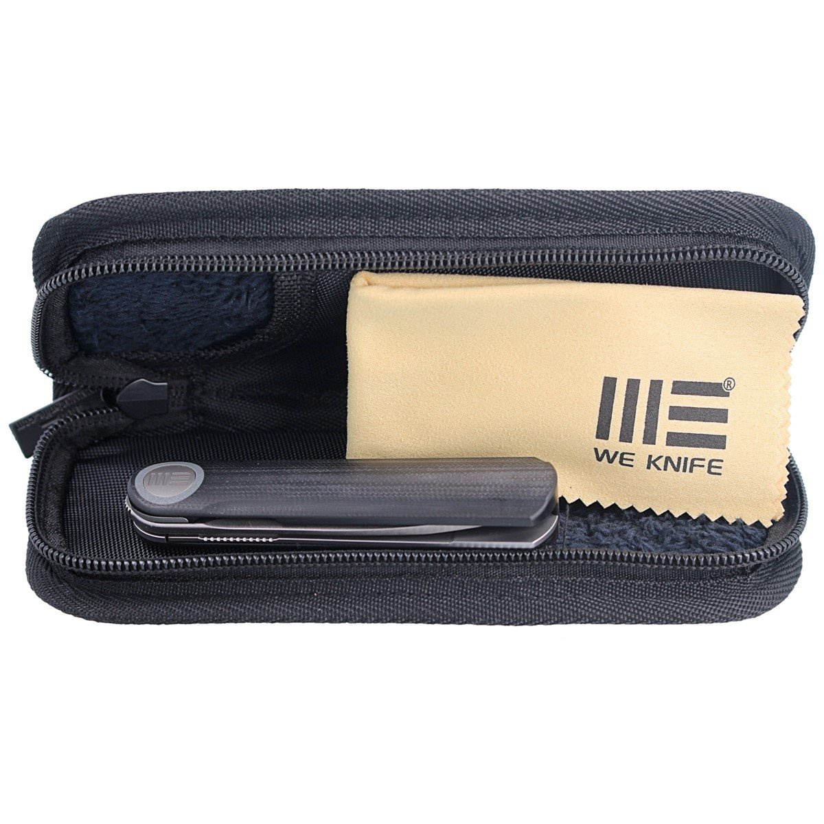 Rękojeść - monolityczna, wykonana z jednego kawałka frezowanego obrabiarkami CNC 3D czarnego kompozytu G10. Zapewnia to niewiarygodną wytrzymałość, wymaga jednak najwyższych umiejętności i precyzji w produkcji. Oś pivota zdobi stylizowane logo marki WE. Prawostronny, jednopozycyjny tytanowy klips deep carry pozwala przenosić dyskretnie w kieszeni nóż w pozycji tip-up (ostrzem do góry).