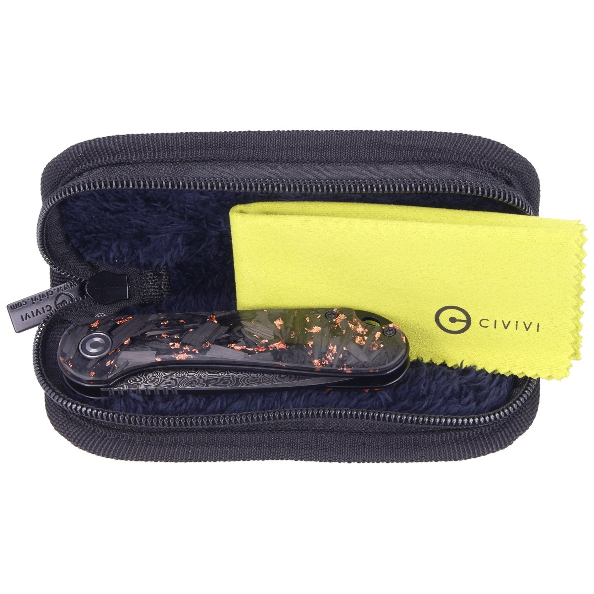 Rękojeść to okładziny o niepowtarzalnym wzorze 3D z mieszanki czarnego Carbon Fiber i kawałków miedzi zatopionych w przezroczystej żywicy, które zostały przykręcone do stalowej ramy noża. Otwarta konstrukcja tzw. open-backed bez typowego backspacera, mocowana do siebie stalowymi tulejami dystansowymi ułatwia czyszczenie. Oś pivota zdobi stylizowane logo marki Civivi. Prawostronny metalowy klips deep carry pozwala przenosić dyskretnie nóż w kieszeni w pozycji tip-up (ostrzem do góry). Nad klipsem lanyard hole, owalny otwór na linkę.