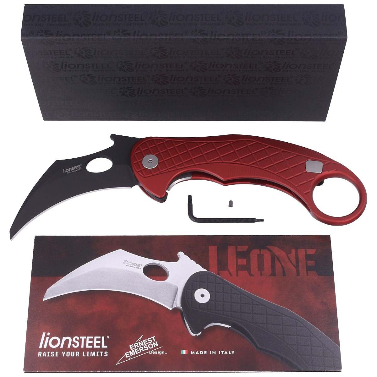 L.E.One (LionSTEEL-Emerson One) Red Aluminium, Chemical Black najbardziej zaawansowany technicznie składany karambit na świecie! Opatentowane technologie Lionsteela i niepowtarzalny projekt Emerson Design! Wyjątkowy folder włoskiej manufaktury wyposażony w ostrze ze stali CPM MagnaCut, hak Emerson Wave oraz flipper w technologii „ReF”.