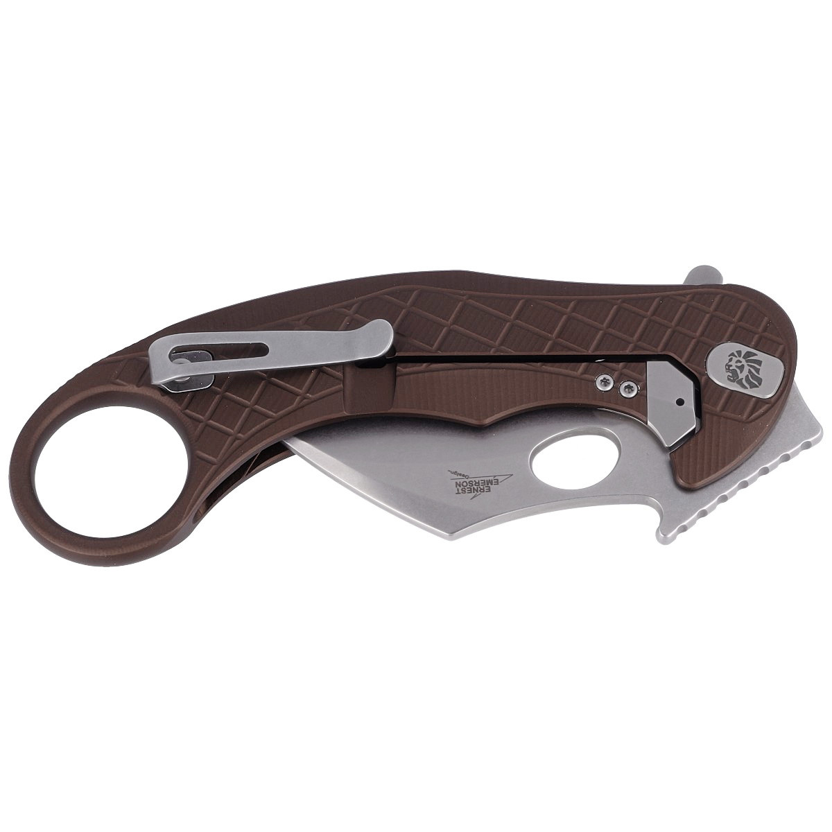 L.E.One (LionSTEEL-Emerson One) Brown Aluminium, Stone Washed najbardziej zaawansowany technicznie składany karambit na świecie! Opatentowane technologie Lionsteela i niepowtarzalny projekt Emerson Design! Wyjątkowy folder włoskiej manufaktury wyposażony w ostrze ze stali CPM MagnaCut, hak Emerson Wave oraz flipper w technologii „ReF”.