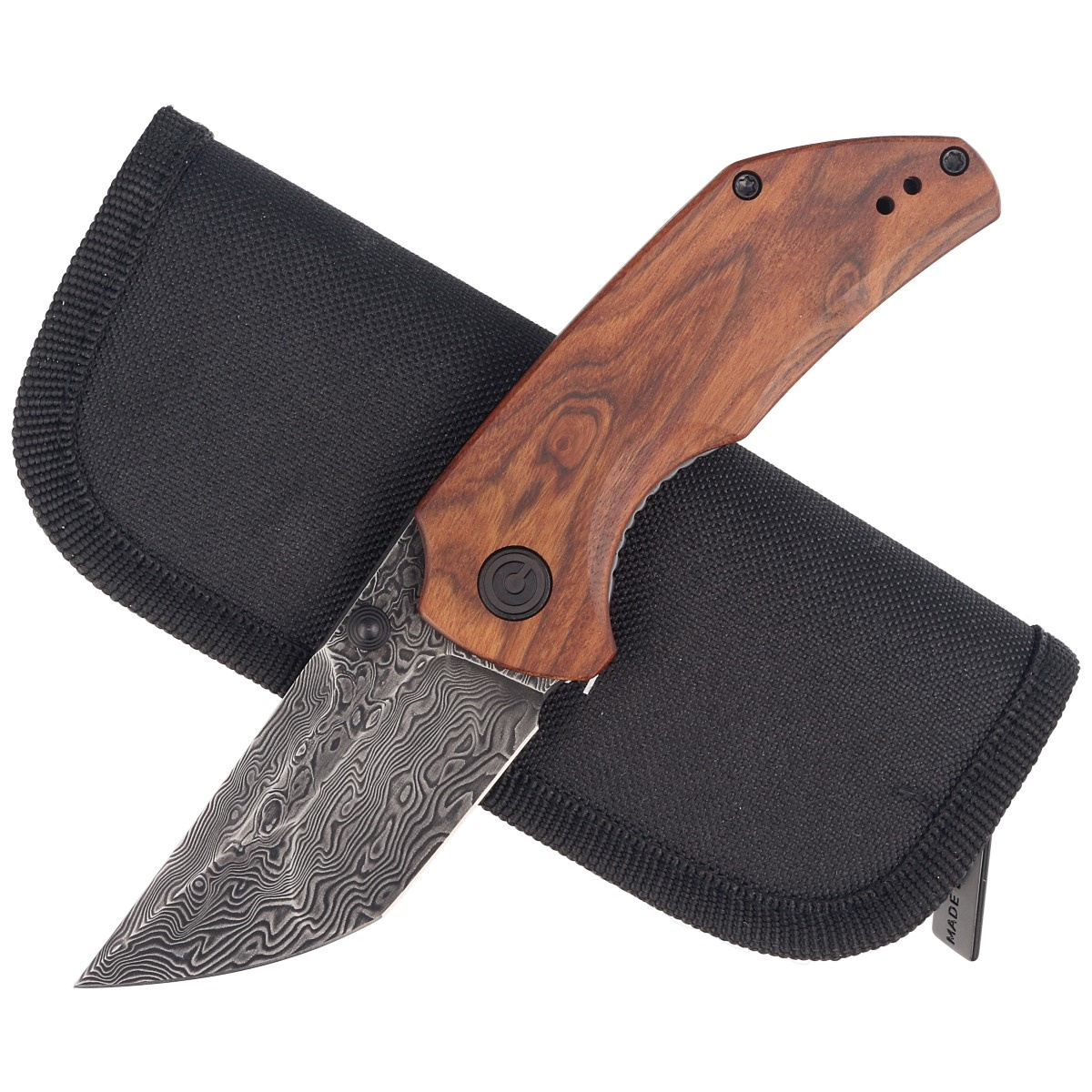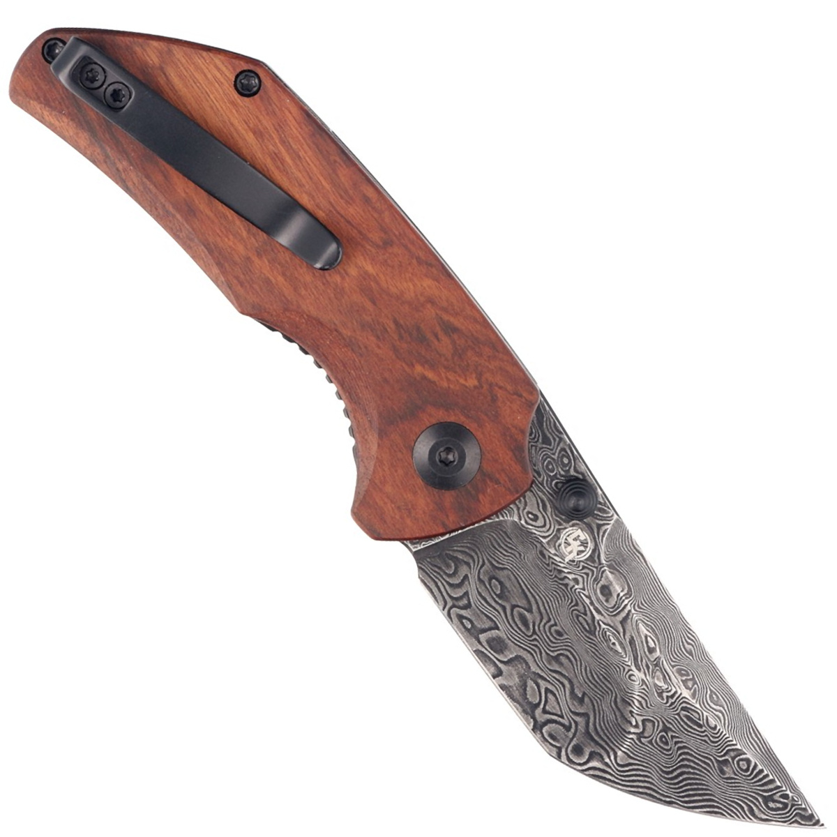 - Thug 2 Cuibourtia Wood, Black Damascus ekskluzywna wersja mocno zbudowanego foldera. Projekt znanego producenta noży na zamówienie Matta Christensena, obecnie w tańszym, lecz wciąż doskonałym wykonaniu firmy Civivi. Ukłon dla miłośników taktycznych noży.