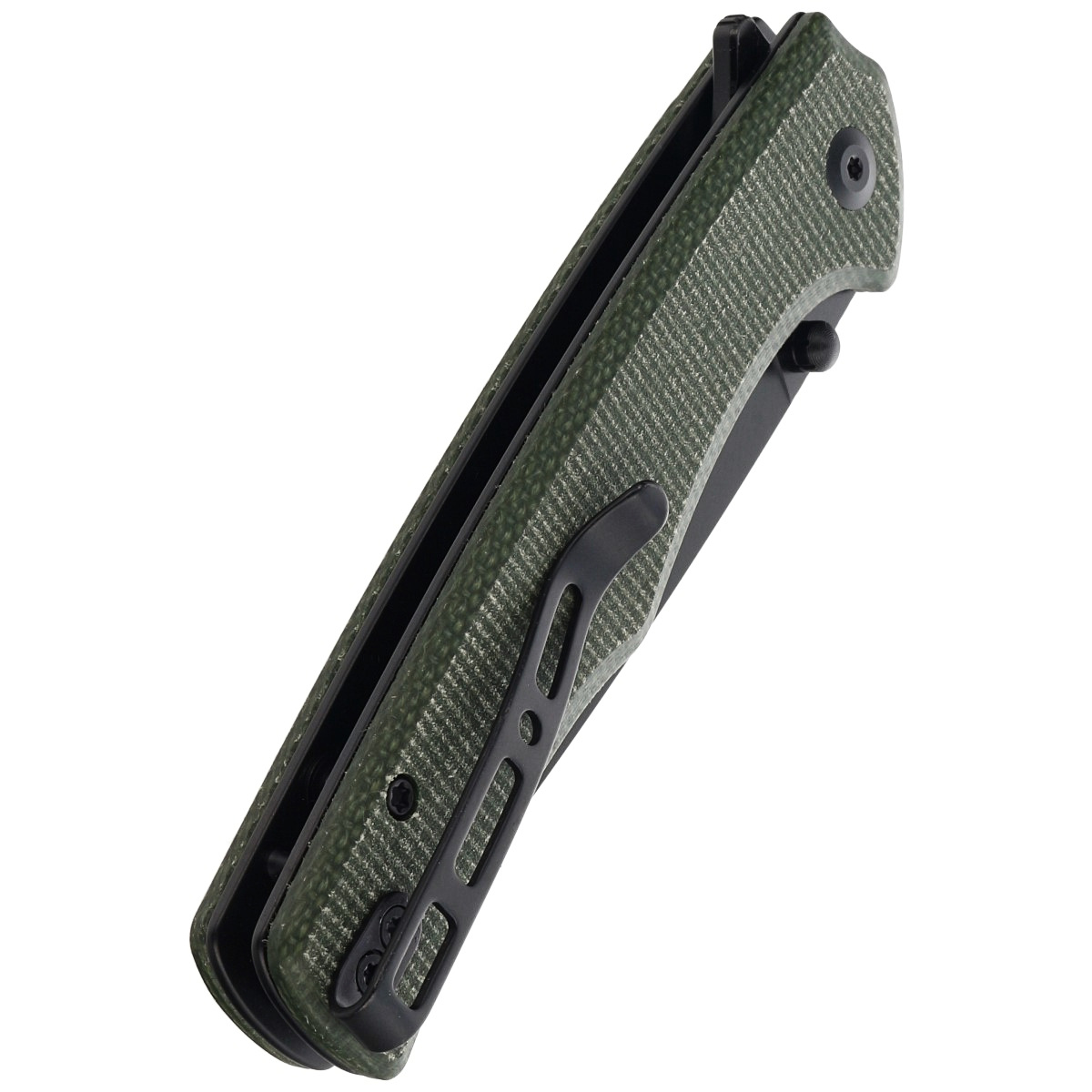 Rękojeść - w zielonym kolorze. Wykonana z Micarty, kompozytowego materiału z płótna prasowanego pod ciśnieniem z syntetyczną żywicą. Fazowane krawędzie okładek eliminują ostre krawędzie dla wygody, uchwytu. Otwarta konstrukcja tzw. open-backed mocowana stalowymi tulejami dystansowymi redukuję wagę oraz ułatwia czyszczenie. Dwupozycyjny, prawo/lewostronny klips deep carry pozwala przenosić dyskretnie nóż w kieszeni w pozycji tip-up (czubkiem ostrza ku górze).