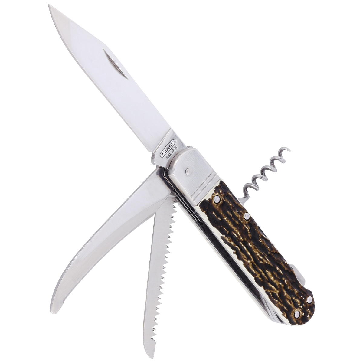 Fixir Imit. Dear Stag, Mirror doskonały scyzoryk myśliwski. 4 ostrza, 4 funkcje. Solidna, wytrzymała konstrukcja, okładziny z imitacji rogu jelenia, mocna blokada głównego ostrza. Piła, ostrze do skórowania i korkociąg. Uniwersalne narzędzie dla myśliwego. Mikulasovice to region, który od 1794 roku specjalizuje się w produkcji wyrobów nożowniczych, będąc nazywanym "czeskim Solingen".