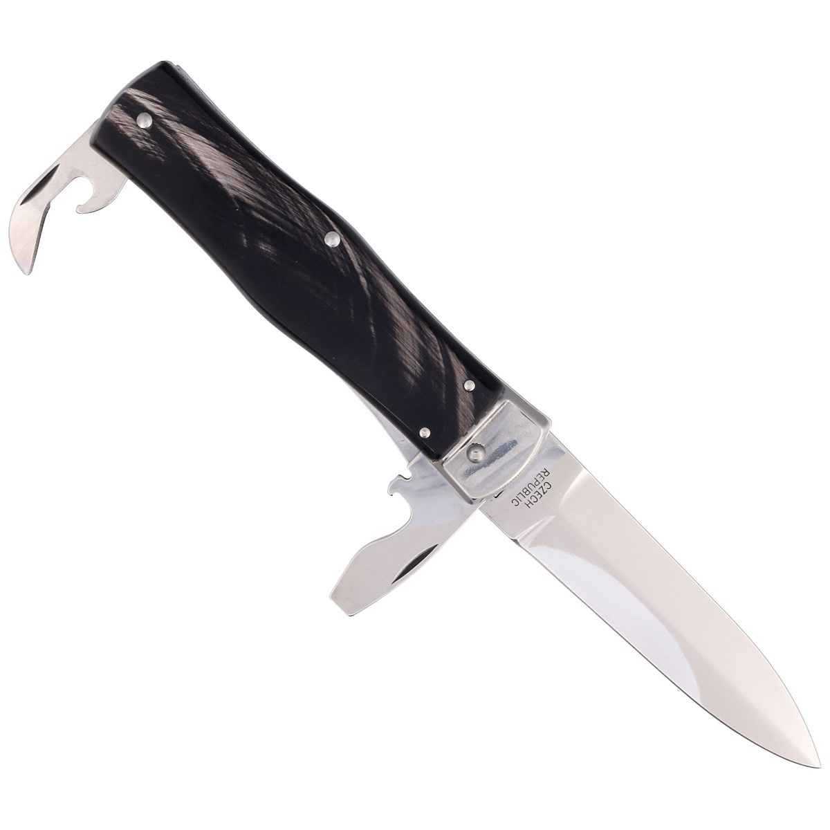 Predator Buffalo Horn, Mirror 3 blades, ilość ostrzy (3), ilość narzędzi (5). Nóż automatyczny (switchblade) czeskiej firmy Mikov z Mikulasovic z trzema ostrzami oraz okładzinami z rogu bawoła. Mikulasovice to region, który od 1794 roku specjalizuje się w produkcji wyrobów nożowniczych, będąc nazywanym "czeskim Solingen". Ilość ostrzy (3), ilość narzędzi (5) sprawia, że nóż jest niezwykle funkcjonalny.