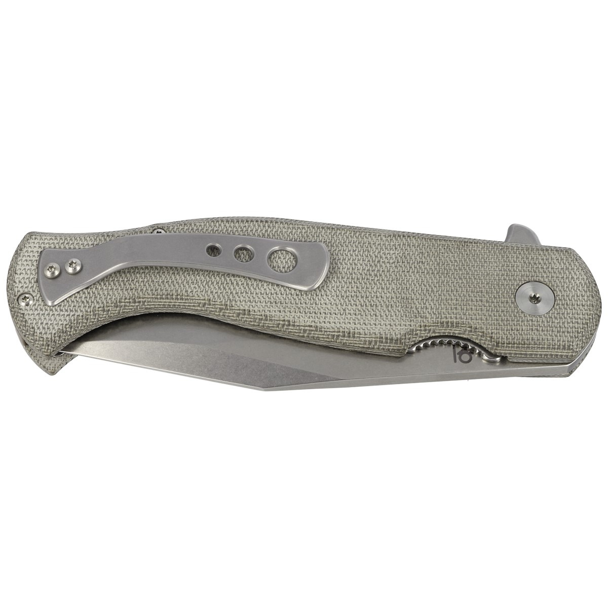 Rękojeść - z zielonej Micarty (płótno prasowane pod wysokim ciśnieniem z żywicą syntetyczną), fazowane krawędzie okładek eliminują ostre krawędzie, a wykonane z przodu podcięcie na palec (fore finger groove) poprawia pewność uchwytu. Okładziny przykręcono do misternie obrobionego aluminiowego backspacera, dają pewność wieloletniego użytkowania. Na całej długości backspacera wykonano upper jimping, karbowane oparcie pod dłoń. Jednopozycyjny (prawa) stalowy klips deep carry pozwala przenosić dyskretnie nóż w kieszeni w pozycji tip-up (czubkiem ostrza do góry). W tylnej części ukryty lanyard hole, otwór do przewleczenia linki zabezpieczającej lub ozdobnej.